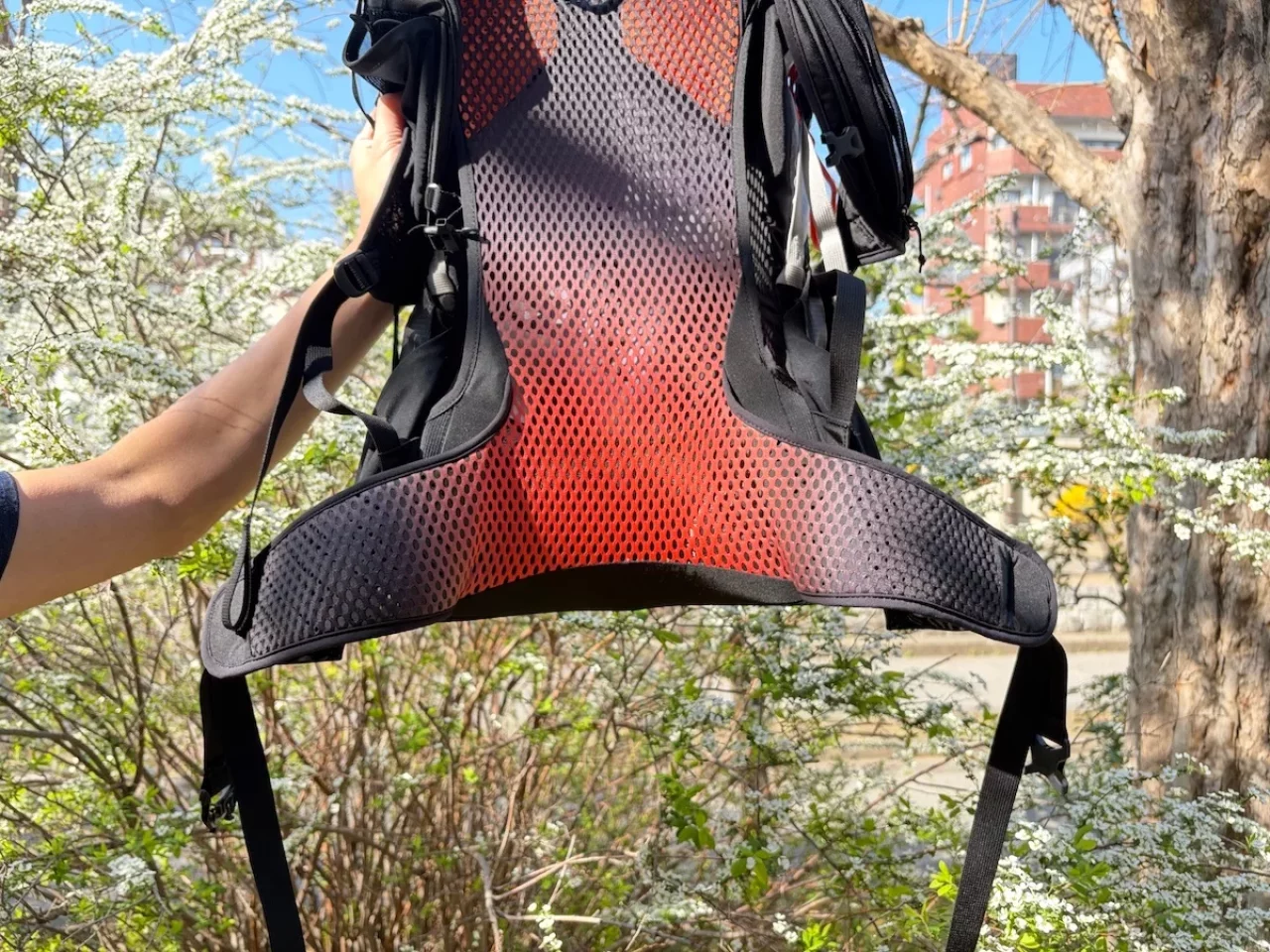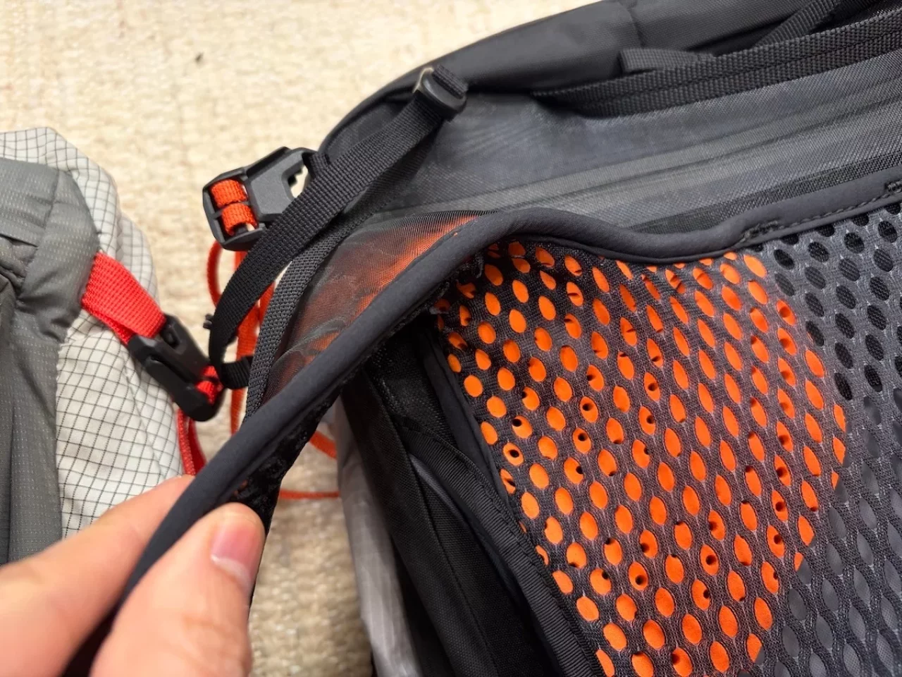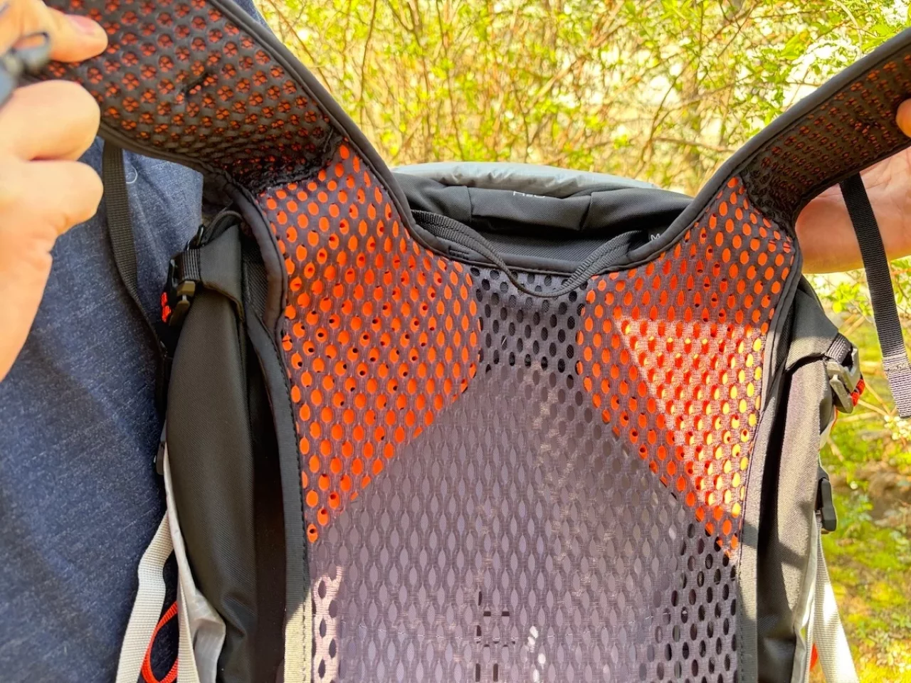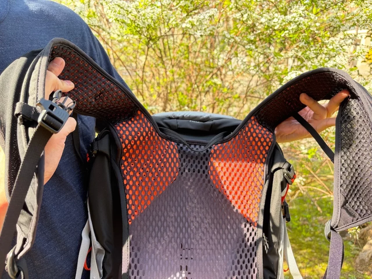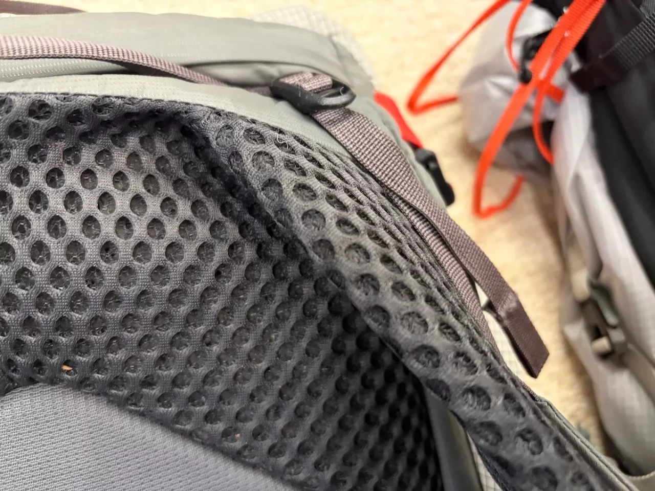 肩甲骨の上部から肩の前面にかけては、柔らかなオレンジ色のクッション素材が配置されています。この部分は幅を持たせた設計になっているため、荷重がかかっても肩に食い込むことがありません。