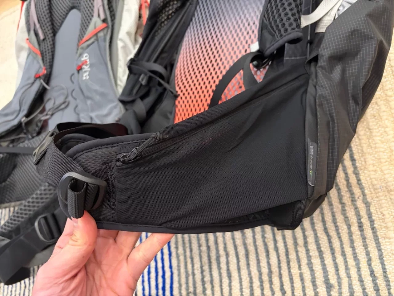 ウエストベルトもショルダーハーネスと同様にシームレスにデザインされており、柔らかなクッション素材によって腰回りを優しく包み込む仕上がりです。ただし、ザックのボトム部分を体にしっかりと引き寄せる構造については、Muon 40の方に軍配が上がるように感じられました。