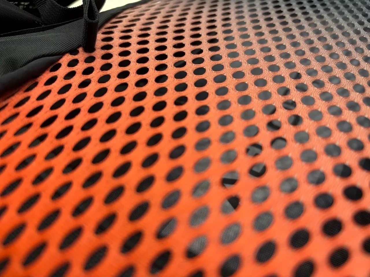 背中に接触する背面パネルには、大きな穴を備えたメッシュ生地が採用されています。細かく編み込まれたこの素材はストレッチ性も備えており、汗抜けが良く乾きが早いだけでなく、背中の形状に合わせてぴったりとフィットする心地よい感触を得ることができます。