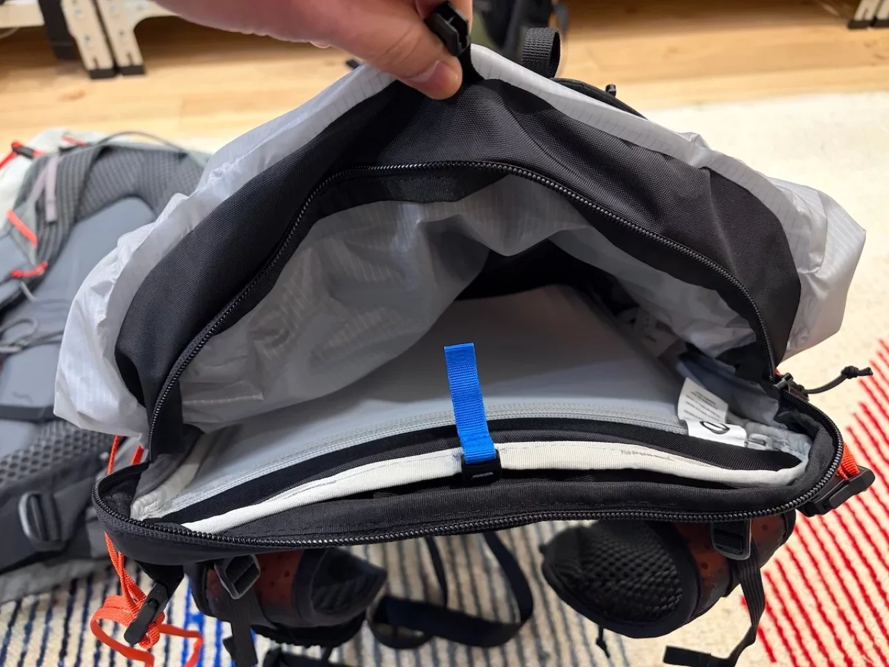 トップに配置されたU字型のジッパーポケットには、ハイドレーションを収納することができます。このハイドレーションポケットに、凍らせたプラティパスのソフトボトルを入れておくと背中がひんやりと涼しいため、夏の登山には特におすすめの使い方です。