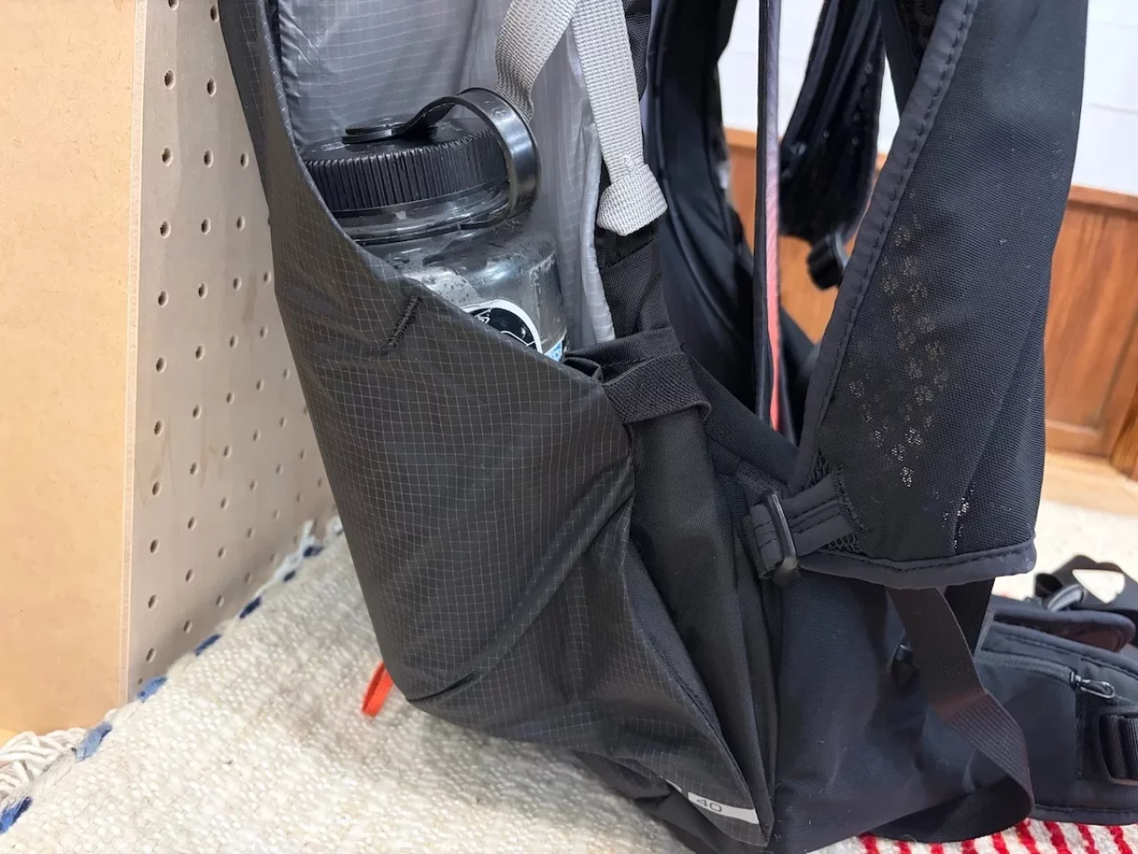 ただし、このサイドポケットへのアクセスは、背負ったまま物の出し入れをするのが難しく、一度ザックを肩から下ろして取り出す必要がある点が少し気になりました。 また、Muon 40ではスタンドコージー(保温ケース)に入れたアルファ米などを、そのままサイドポケットに収納して行動食として食べることができましたが、ポケットがスリムになったことでそれが難しくなっています。
