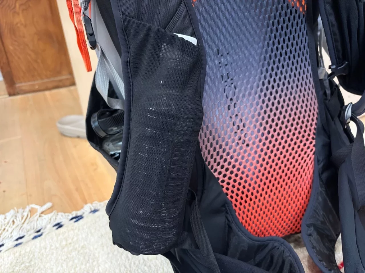 ショルダーハーネスの右側には、深型のメッシュポケットが備わっています。ここにはソフトフラスクなどを入れておくようなデザインになっており、500mlのペットボトルを収納するのにも便利です。