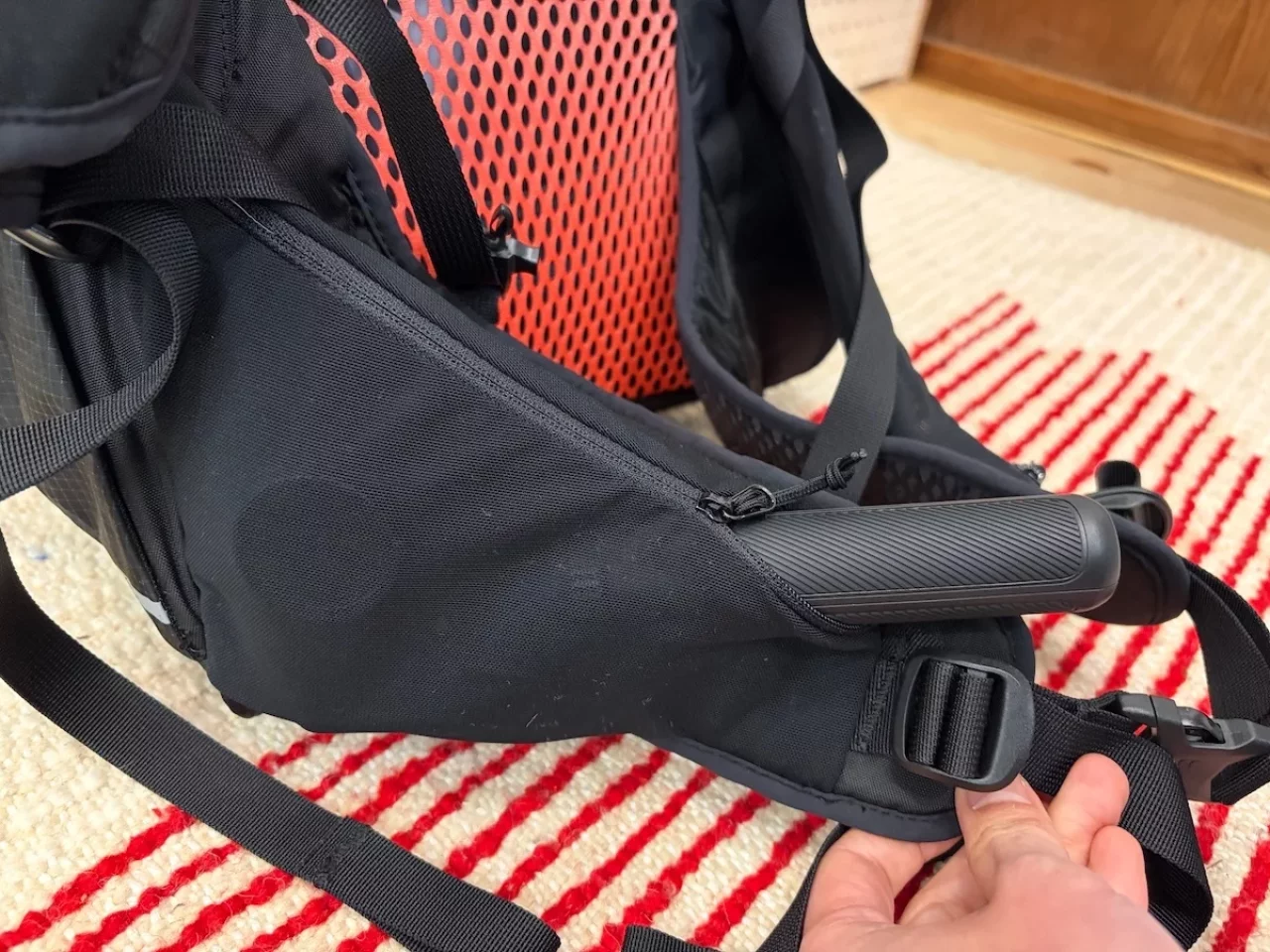 同じ丈夫な素材を用いたサイドポケットは、テントポールやトレッキングポール、またボトルなどを収納するのに適しています。Muon 40のサイドポケットは非常に大きく作られており、ボトルを収納しておくと落下してしまいそうで少し不安がありましたが、サイクロン XP 40は縦型のスリムなポケット構造になっており、その心配がありません。