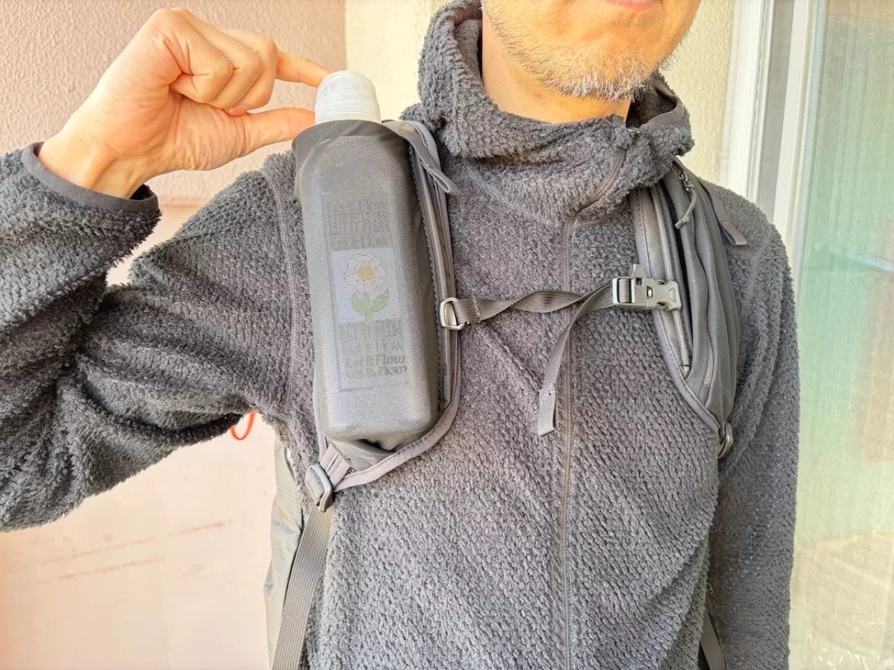 ただ、一般的な500mlのペットボトルを収納すると、ボトルの直径によって胸のあたりに少し干渉を感じることがあります。私はそれが少し気になってしまうため、「山旅」の長方形ペットボトルを使用するようにしています。まるでこのボトルのためにデザインされたかのようなポケットで、個人的にはとても嬉しく感じています。