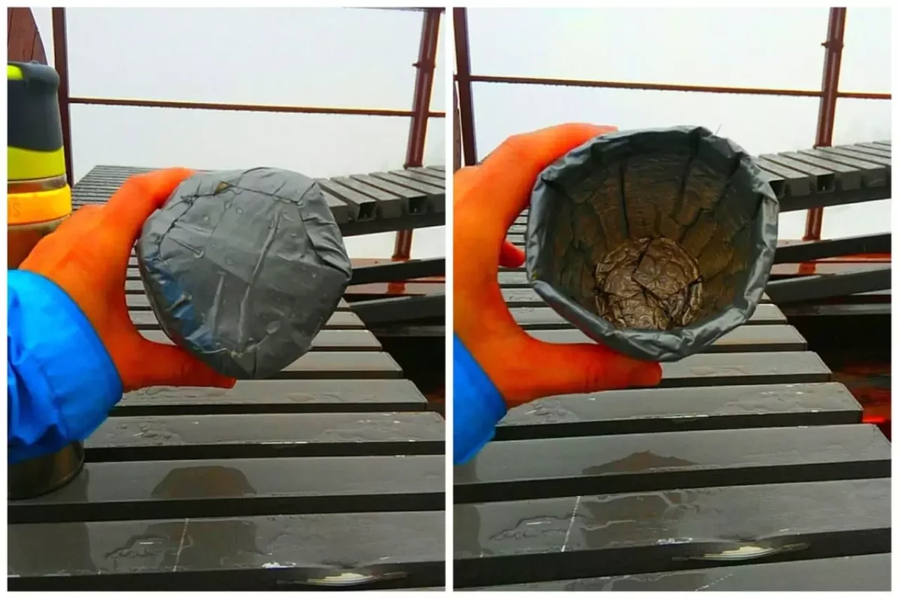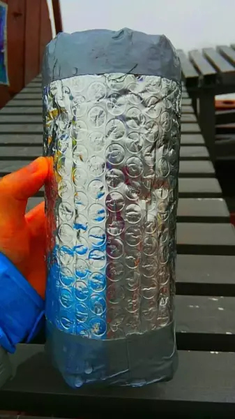 頂いたシートを切り貼りして、ダクトテープでガチガチに貼って、側面と底とで水筒を包み込むように作りました。水筒とシートは固定していないので、スポッと抜けて取れるようになっています。