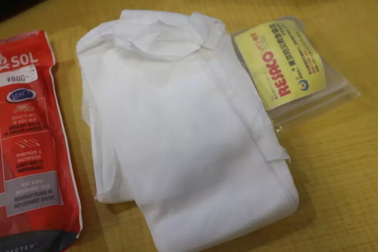 三角巾は2つ持っていくようにしています。腕が折れてしまうような大きな怪我のときって、他の場所も折れていたりする可能性があると考えていて、1枚よりかは2枚の方が安心です。また1カ所が折れてしまっていたとしても、1枚はごく一般的な巻き方をして、もう1枚で身体に巻きつけて固定したほうが、山で搬送する事を考えると安心なので、僕のようなガイドをする立場の人間は2つ持っていた方が良いと思ってます。1枚追加したところで大した重さでもないので、念には念を入れています。