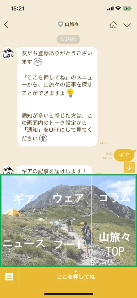 また検索した記事は、山旅々LINE@上で、新着順で該当の記事が表示されるので、直ぐにチェックができます。