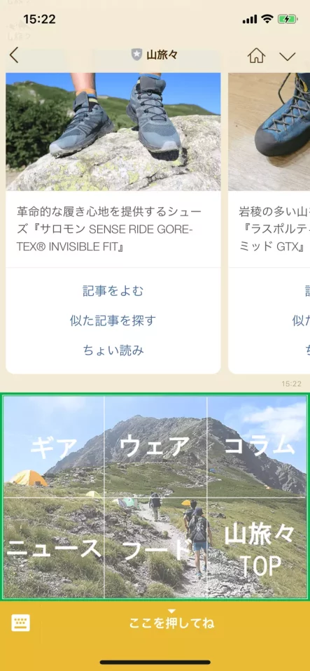 さらに山旅々LINE@では、ギア・ウェアといった装備紹介記事、体験コラムやニュース記事、山ごはんといったカテゴリ別で記事の検索が容易にできます。