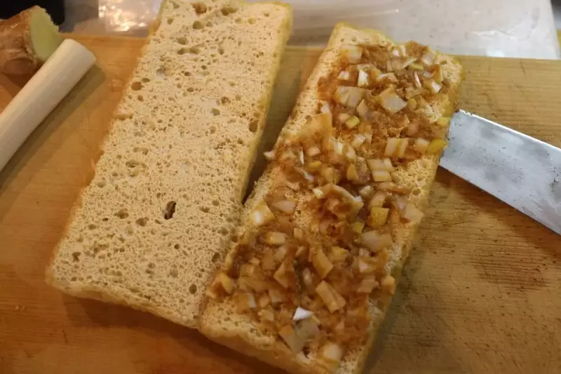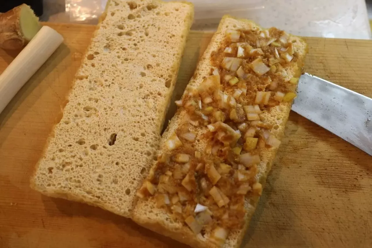 - 細かく刻んだネギと味噌をあえてチーズの上に塗るように挟む