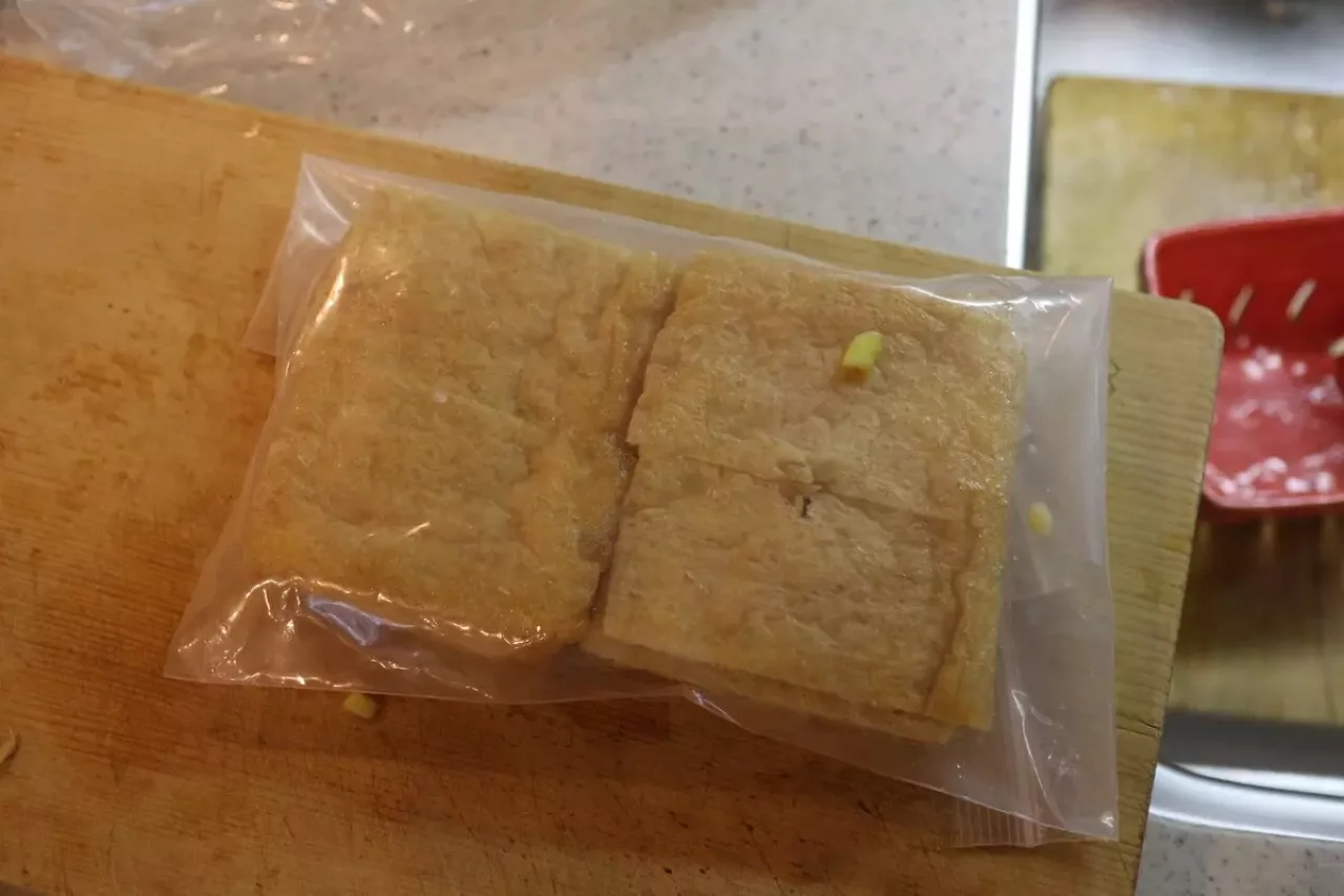 使用するメインの食材、栃尾揚げは、通常の油揚げの約3倍の厚さがあり、ボリューム満点。豆腐を揚げた食材なので、大豆由来の成分が含まれており、栄養満点。登山でしっかり補っておきたい良質なたんぱく質、脂質、炭水化物、カルシウム、マグネシウム、鉄、ビタミンEを含んでいて、非常に優秀な食材。