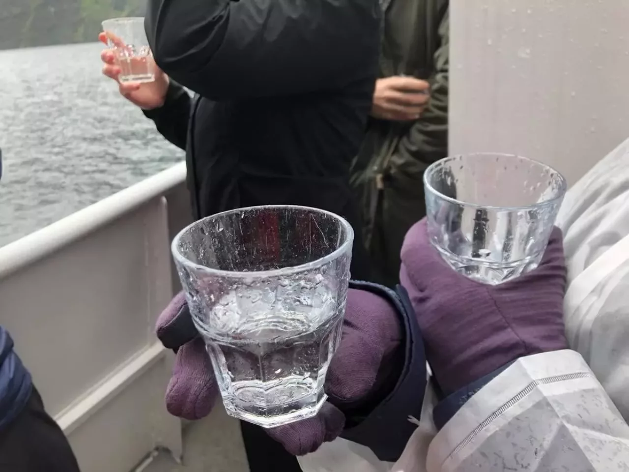 日本ではきっと「危険」という言葉で片付けて、決して行わないような遊びを体験させてくれた。それは船首にグラスを置き滝の水をグラスに入れるというもの。その滝の水を皆に振舞ってくれる。