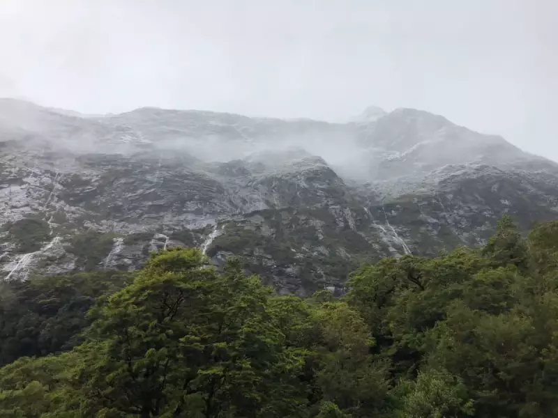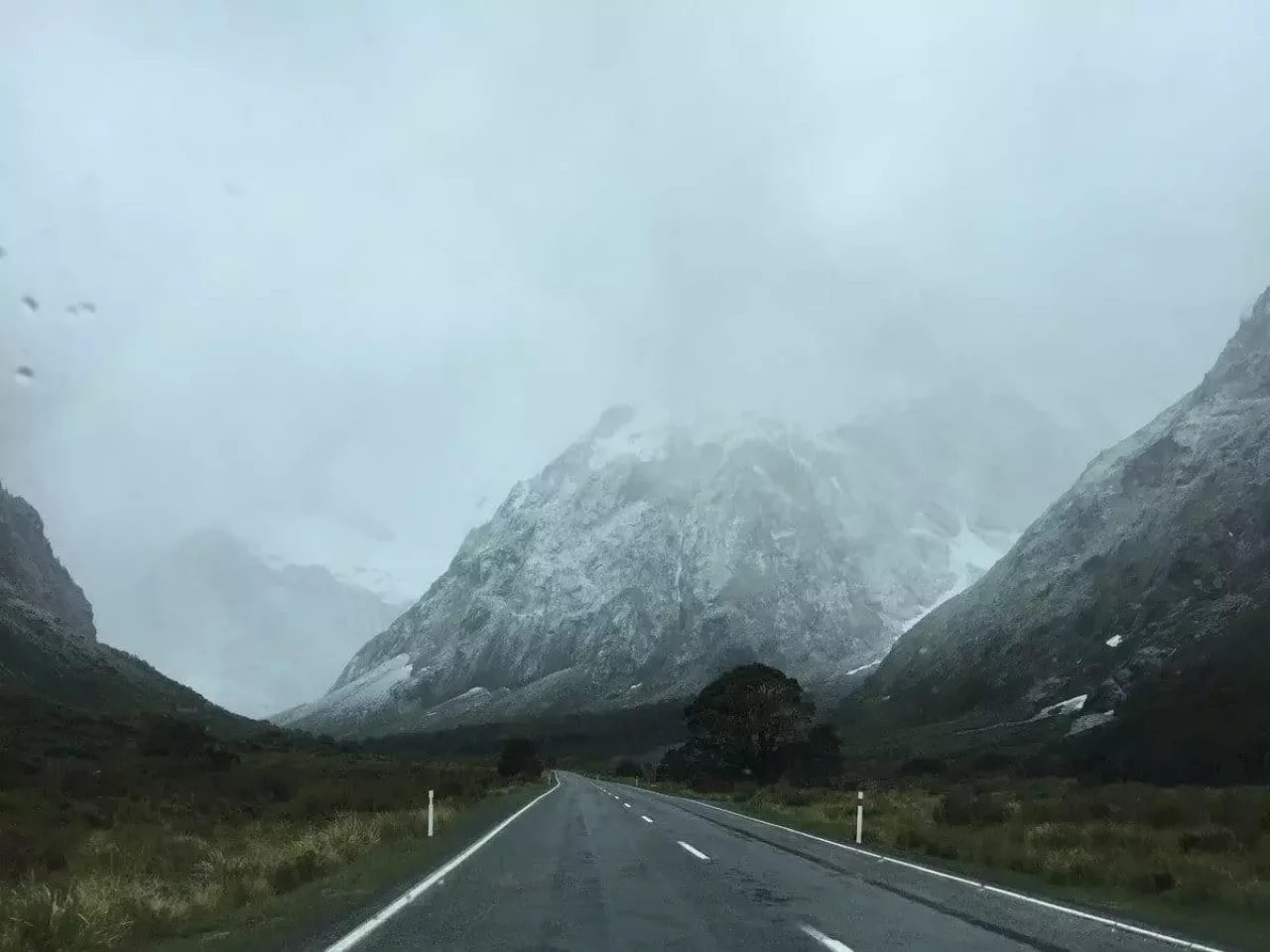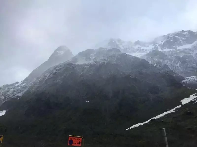 天気は朝からなんと雪。最初はパラパラだったが、ミルフォードサウンドに近づくに連れてドンドン降ってくる。「この車ってスタッドレス履いてない」と気づき、ミルフォードサウンドに到着できない不安が一同つのる。このまま雪が止まなければ、到着したところで、帰りが危ぶまれる。