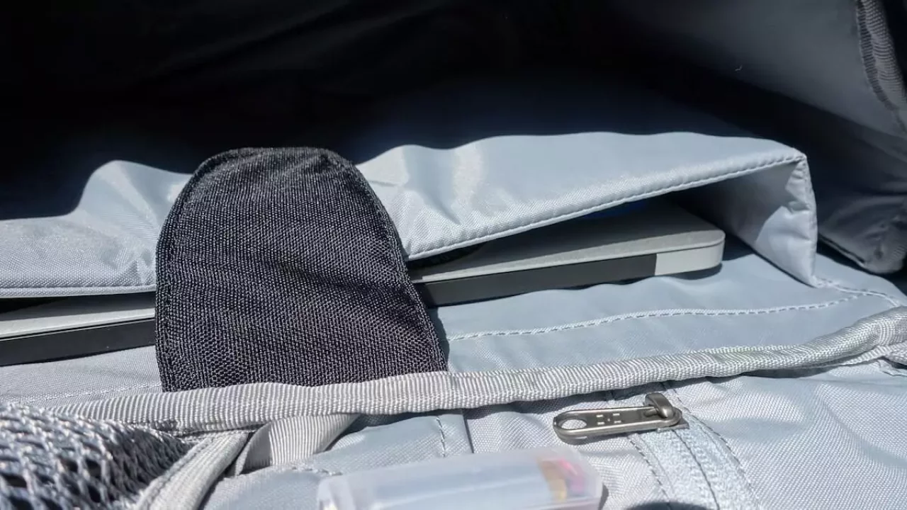 メイン気質の背中側には15インチまでのパソコンが収納可能なスリーブが付いています。あやまって飛び出さないように、ストッパーも付いています。