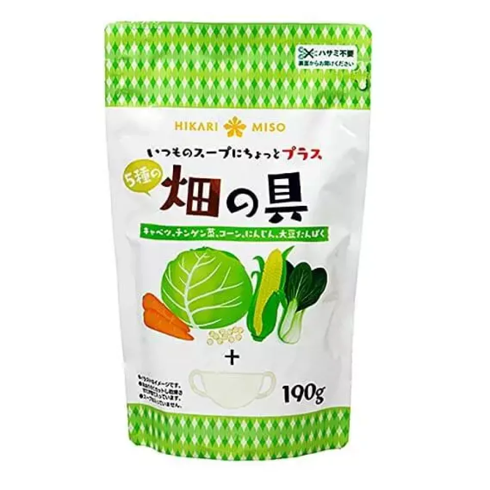 畑の具とあるように、畑で採れる5種類の野菜がミックスされて乾燥具材としてパックされています。具材の内容は、チンゲン菜、キャベツ、にんじん、とうもろこし、大豆たんぱくが入っています。おすすめポイントは乾燥野菜としては価格がお手ごろです。