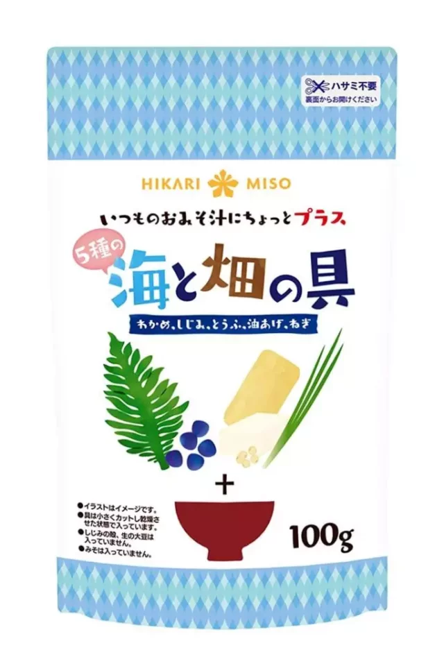 上記と同じシリーズで、こちらは海と畑の具がミックスされています。キャッチコピーも「いつものおみそ汁にちょっとプラス」という味噌汁の具としてオーソドックスな、わかめ、しじみ、油あげ、ねぎ、とうふが入っています。