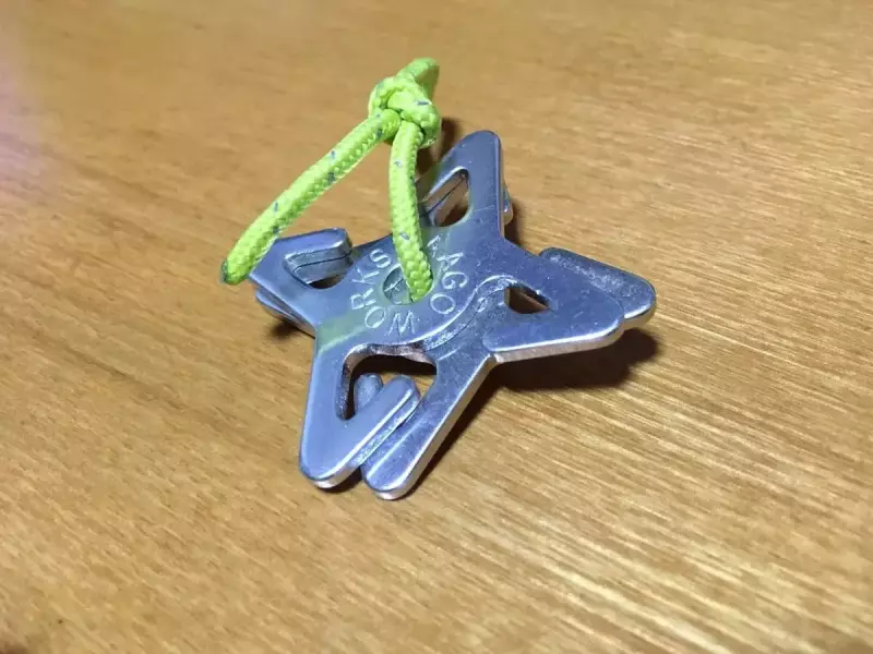 細引きロープを結んだり、絡ませたり、4つのフックを使って色々なロープワークが可能です。テントの張り綱にも使えるしタープにも使えます。ロープワークが楽しくなる、そんな道具が手裏剣です。