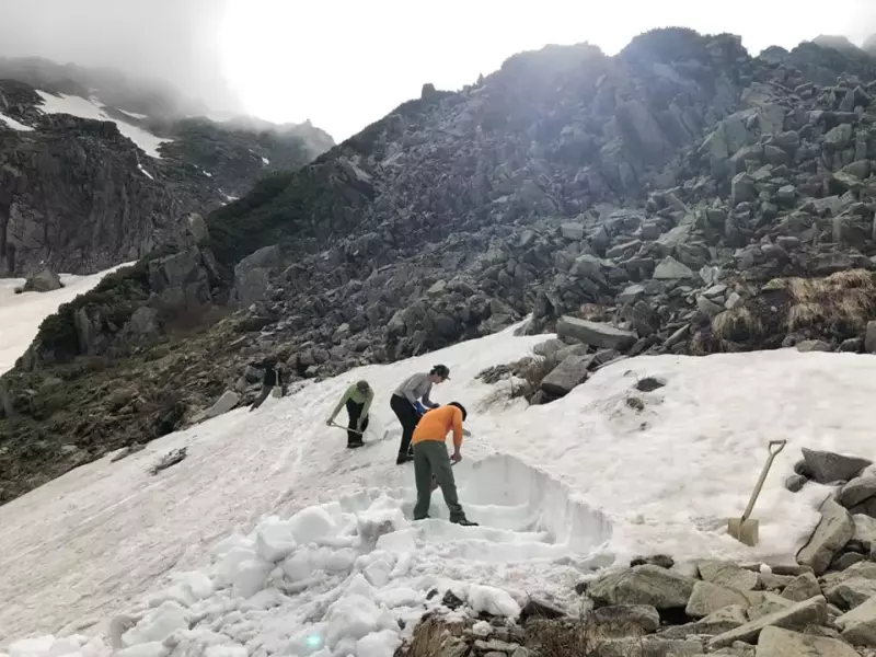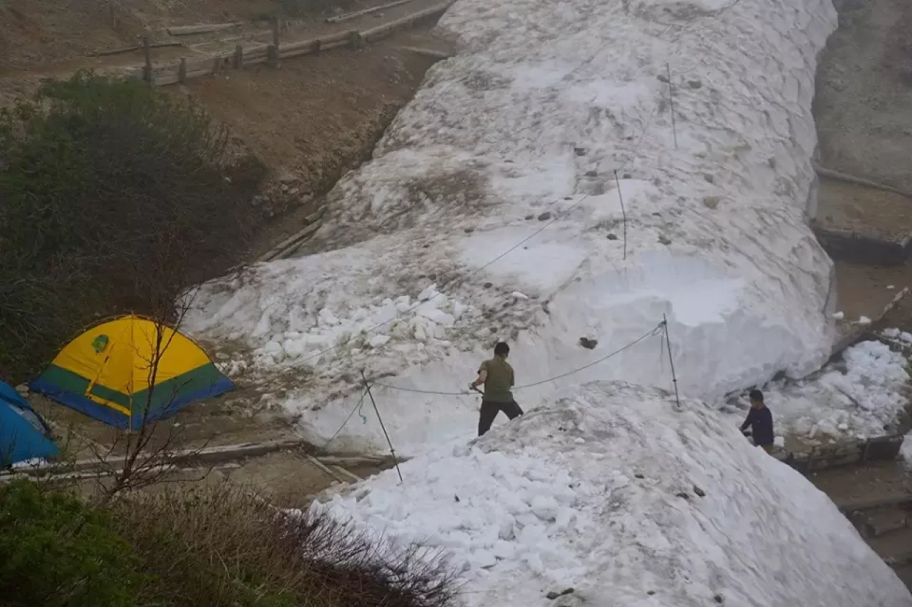この時期、テントを雪の上に張ることにびっくりされるお客様もおられます。燕山荘ではこのテント場の雪が一番最後まで残ります。連休に向けて、テント場の除雪も少しずつですが始めました。