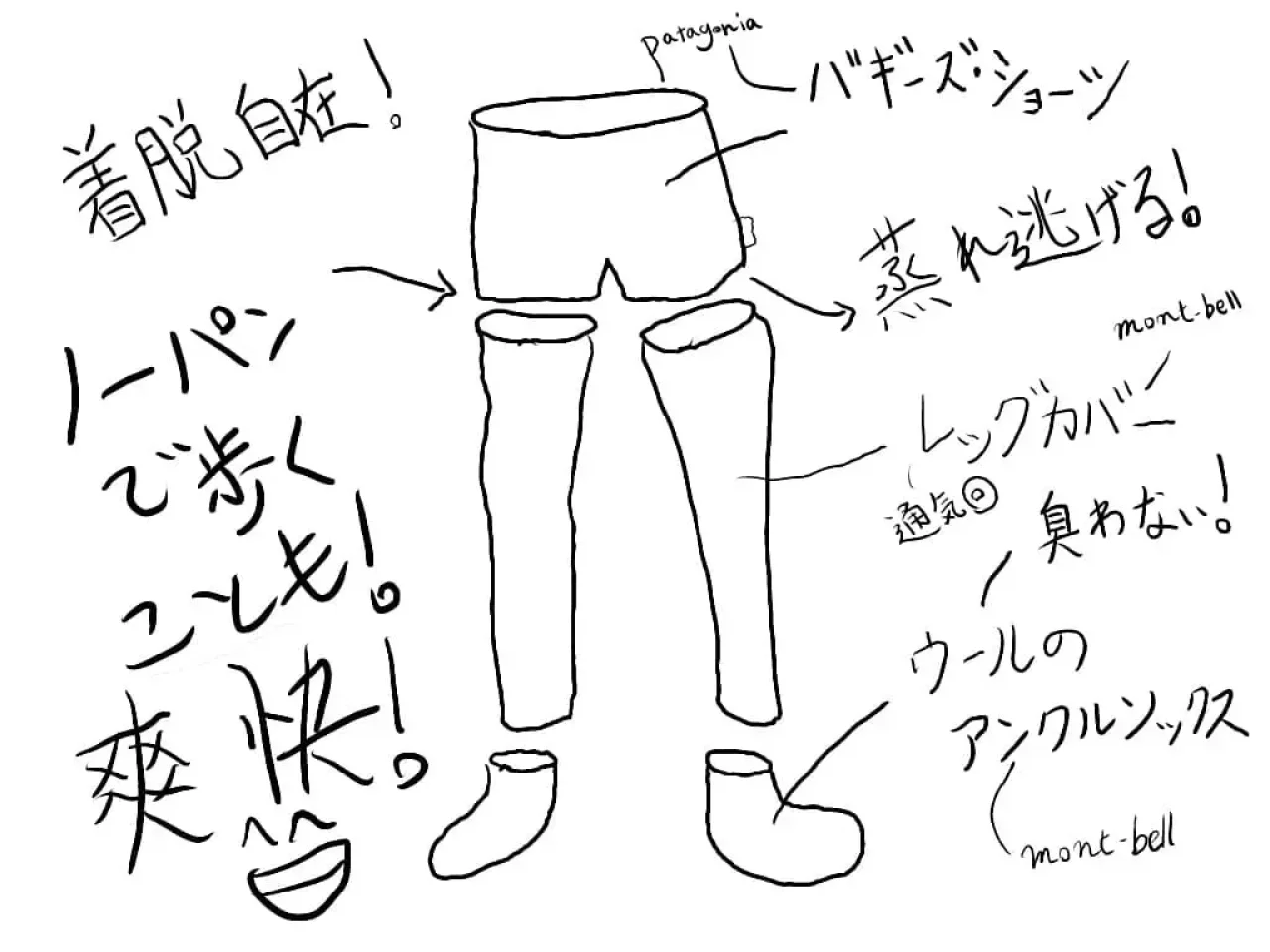 上半身で半袖シャツ+アームカバーが有効であったように、下半身においても半ズボン+レッグカバーというのは有効でした。前半1,700kmほど進んで、持参のトレイルランニングショーツは穴があき、ウエストの紐が脱腸したようになってしまいました。補修が間に合わなくなってトレイルに集中できなくなってしまったので途中からpatagonia社のバギーズ・ショーツに替えました。バギーズ・ショーツは女性用(!)の丈の短いの(!!)を履いていました。