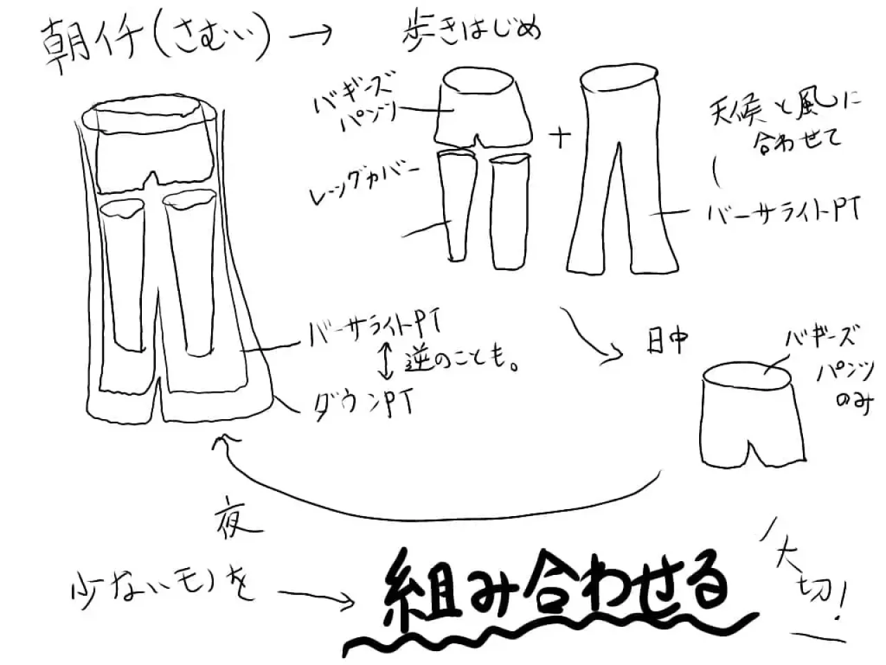 ウェアは高機能なものより、足し引きができるシンプルな組み合わせを考えると、結果コンパクトに済むと思います。小さくなることと速乾性は一貫して重要です。