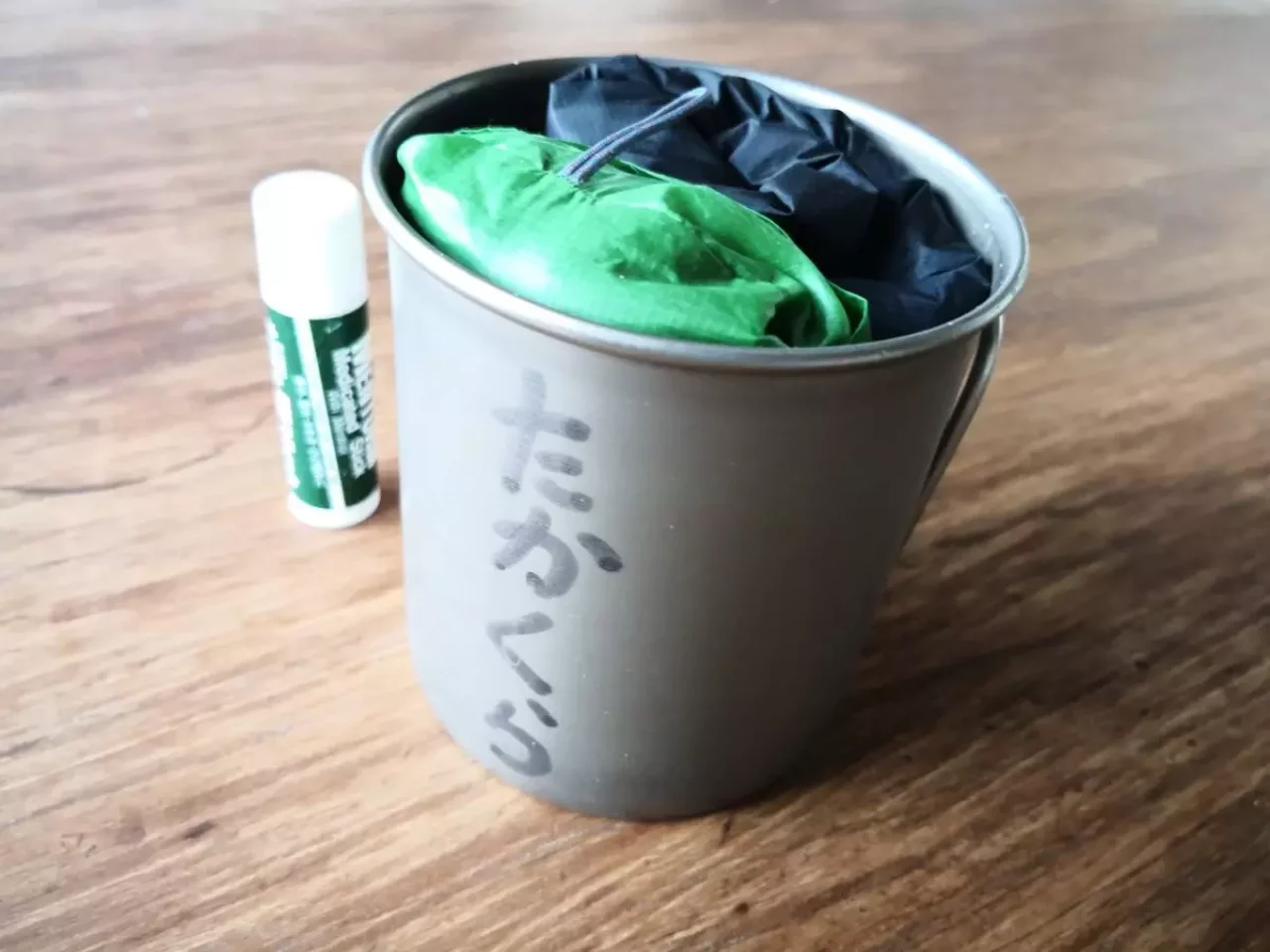 上の画像では450mlのチタンカップにウェアを2着収納しています。何が入っているのでしょうか。これを拡げてみると・・・。