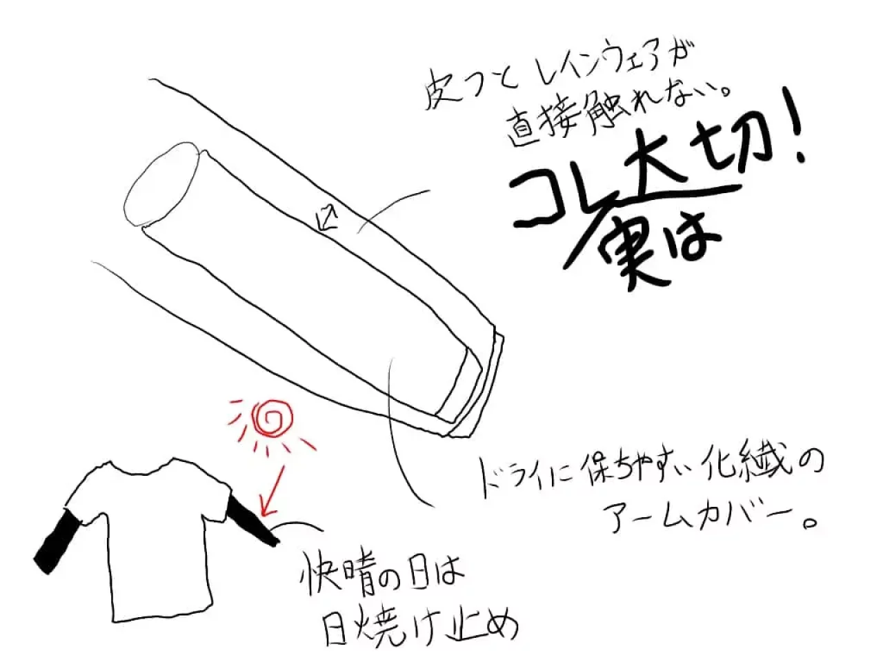 このアームカバーのサブ的な機能で「レインウェアに直接皮膚が触れることを防ぐ」機能が素晴らしいと感じました。いくら透湿性に優れたレインウェアでも運動量が高いときには、蒸れが出てしまいます。そのとき皮膚が直接触れてしまうとぺたついて不快であったり、皮脂がついてレインウェアに悪影響を及ぼすことがあります。アームカバーをつけることで、これらを予防できるわけです。暑いけどレインウェアを着なければならない、そんなシチュエーションの時あえてアームカバーをつけることで少しだけ快適さが増します。手拭いを首に巻くのも同様の効果を得られますね。アームカバー、日焼けも防ぐことができるので本当に重宝しました。アームカバー、ホントおすすめです。