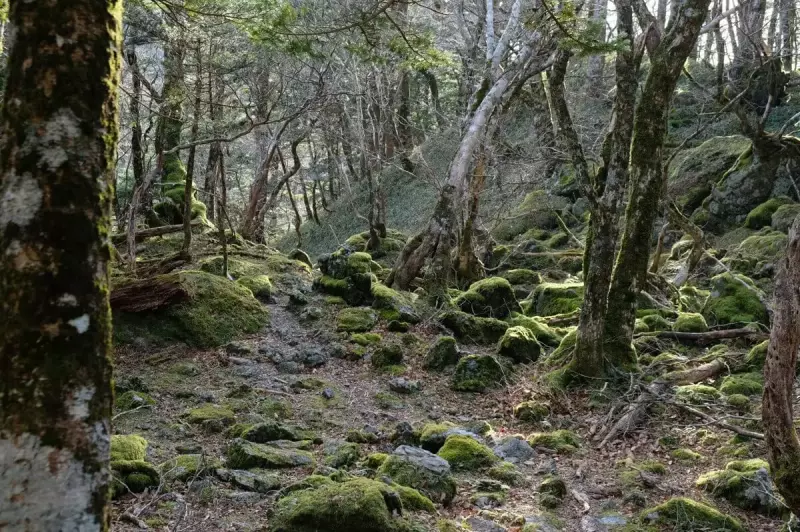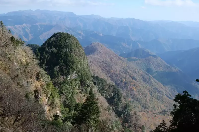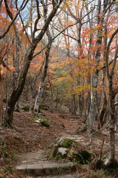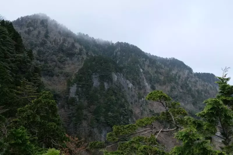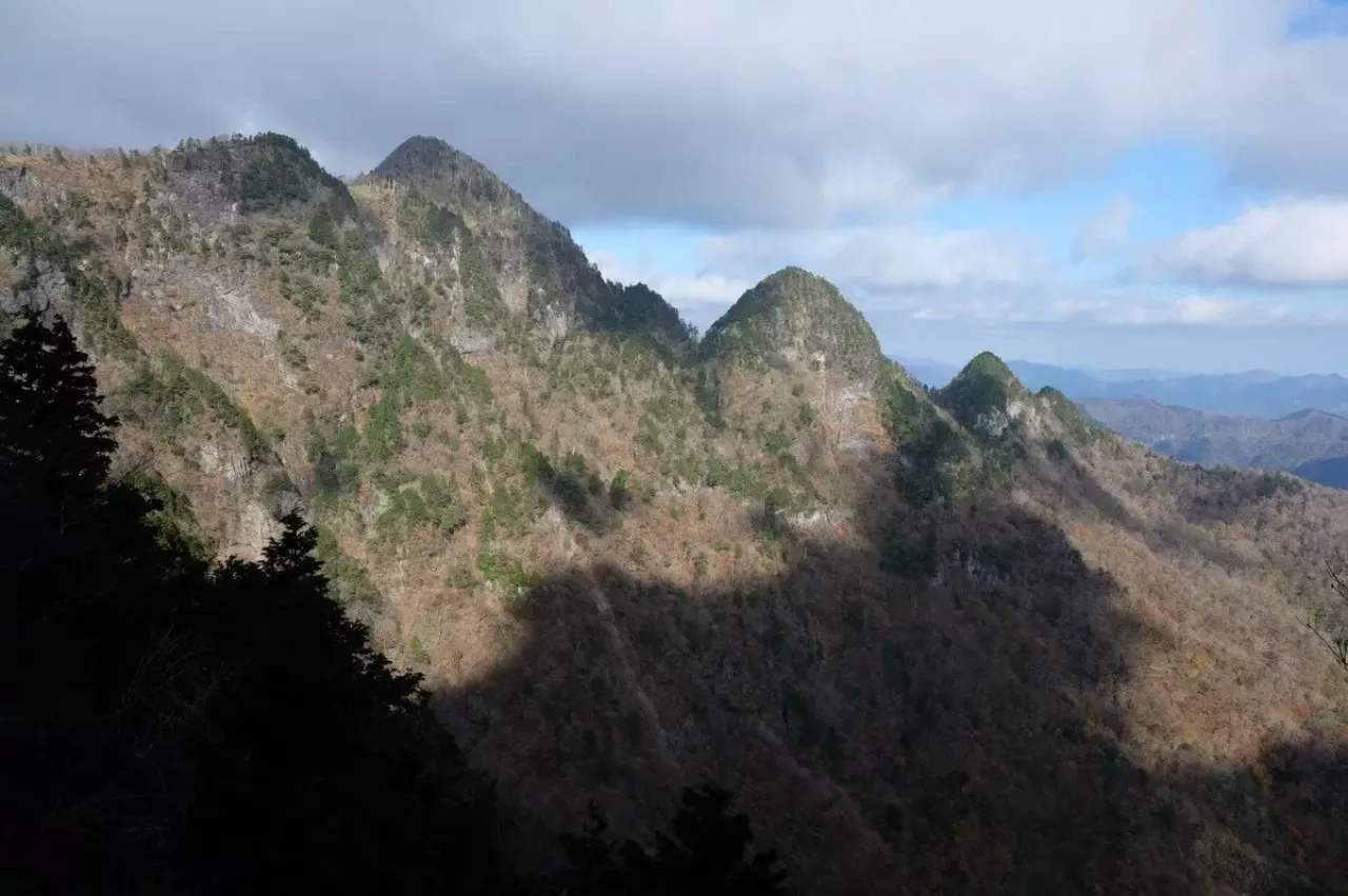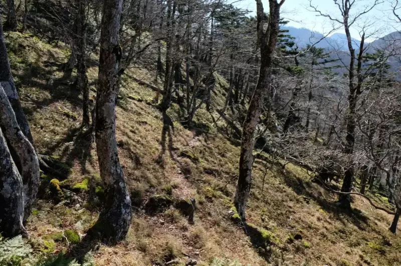 葉の落ちた森の中からはドシンと構えた弥山の山肌が見える。