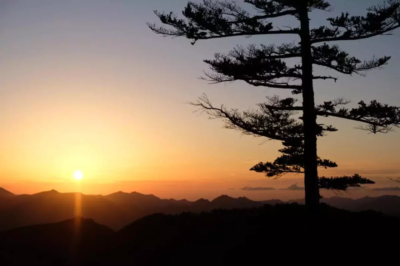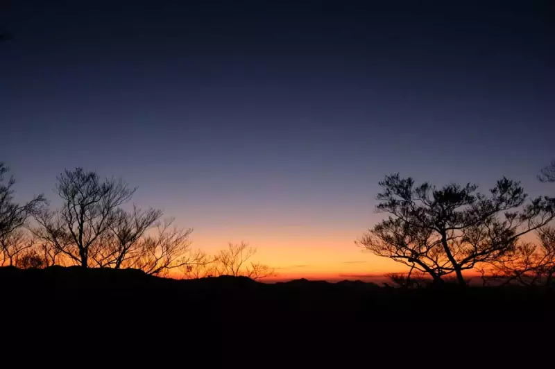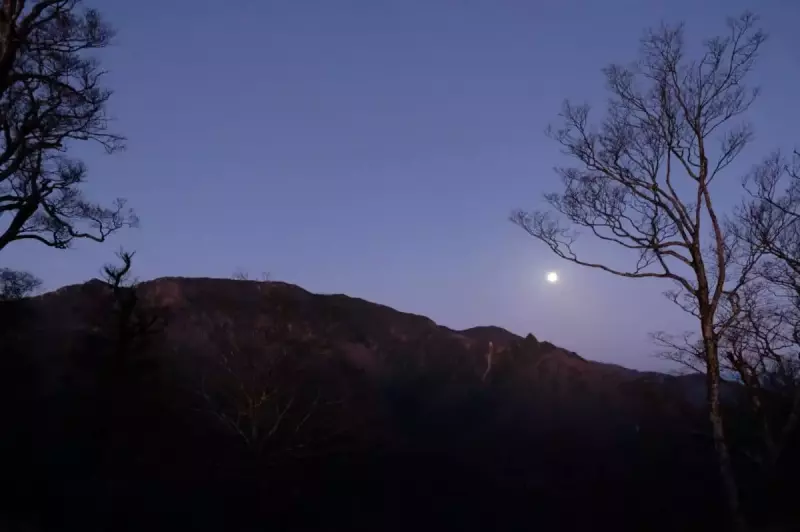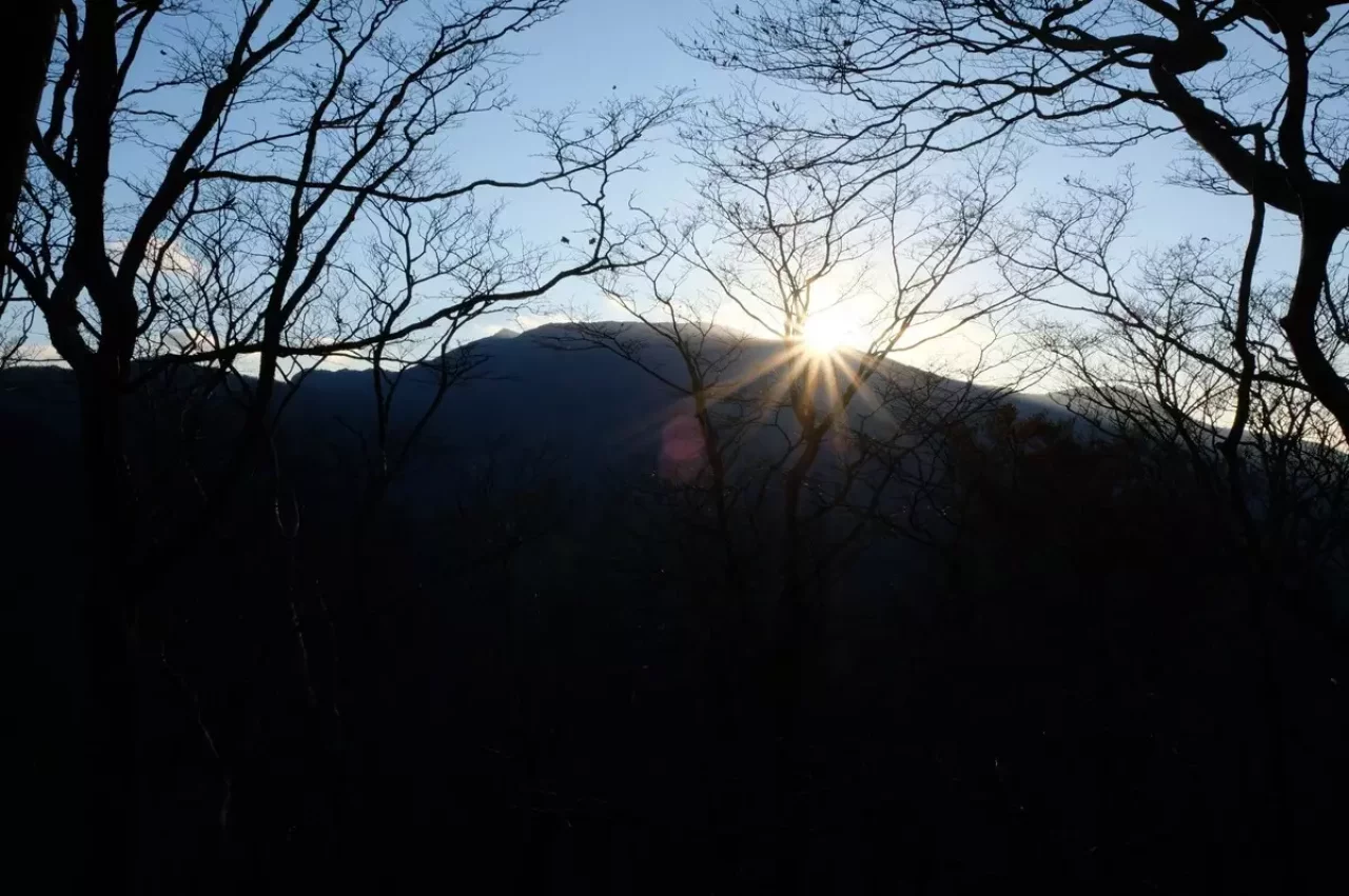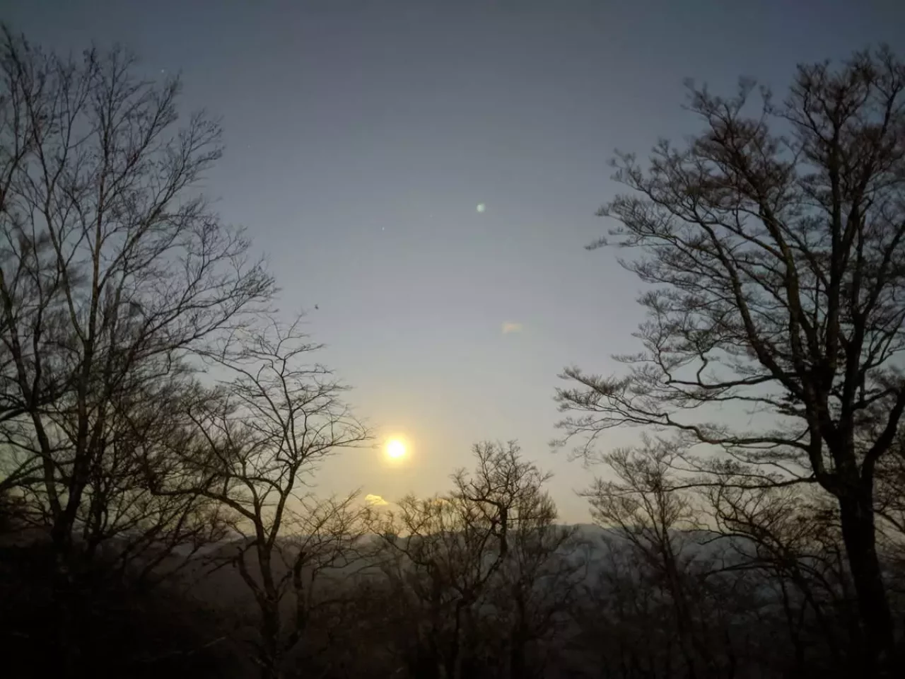 翌朝、満月に照らされた葉の落ちた森の稜線を1人ヘッデンをつけて歩く。