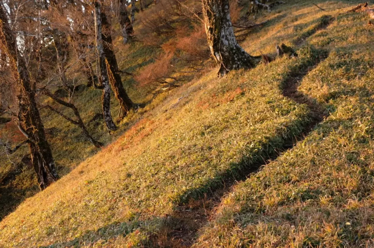 笹の中の道を注意深く見ると、細いし、崩れてるところもあって、