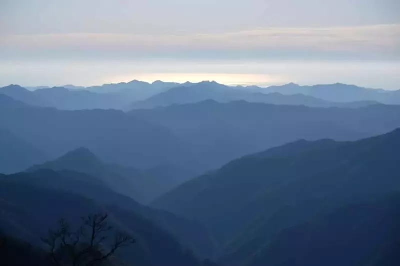 小屋へ向かって降りる時に、南に続く大峰の山並みに光が当たって、