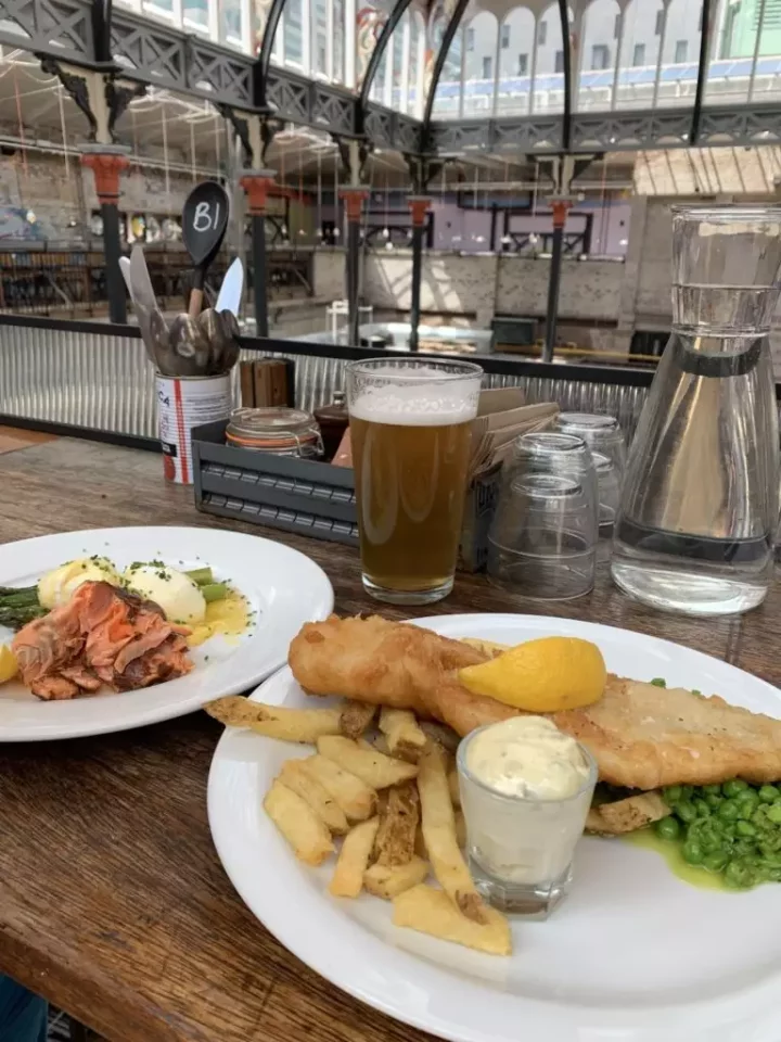 マンチェスターの駅は大きく、スコットランドの歴史ある街並みが多い都市と比べるととても近代的に見えた。 それでも10分ほど歩いて着いたパタゴニアマンチェスターストアは、古い建物が立ち並ぶエリアにあり、お店の前の通りではマーケットをしていて、バイオリンやギターなど演奏している人たちもいた。 フィールドや製品、ヨーロッパの環境活動の話などイギリスの気のいい同僚たちとの時間はあっという間にすぎてしまい、ランチのオススメのお店を聞いて、ストアを後にした。 オススメのお店は、古い建物をリノベーションしたフードコートで、色んな料理のお店とパブもあって、クラフトビールで乾杯した。