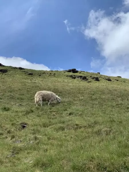 スコットランドのフットパスともまた違いて広がる景色が新鮮だ。同じなのは、やっぱり羊がいることだろうか。ただ顔は黒ではなく、顔の白い子たちだ。