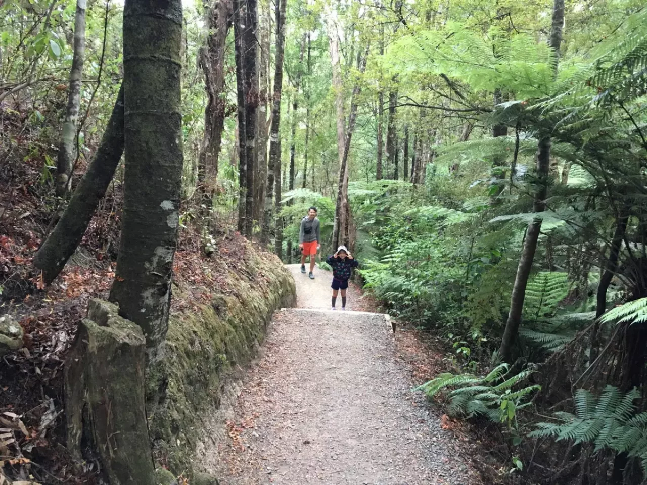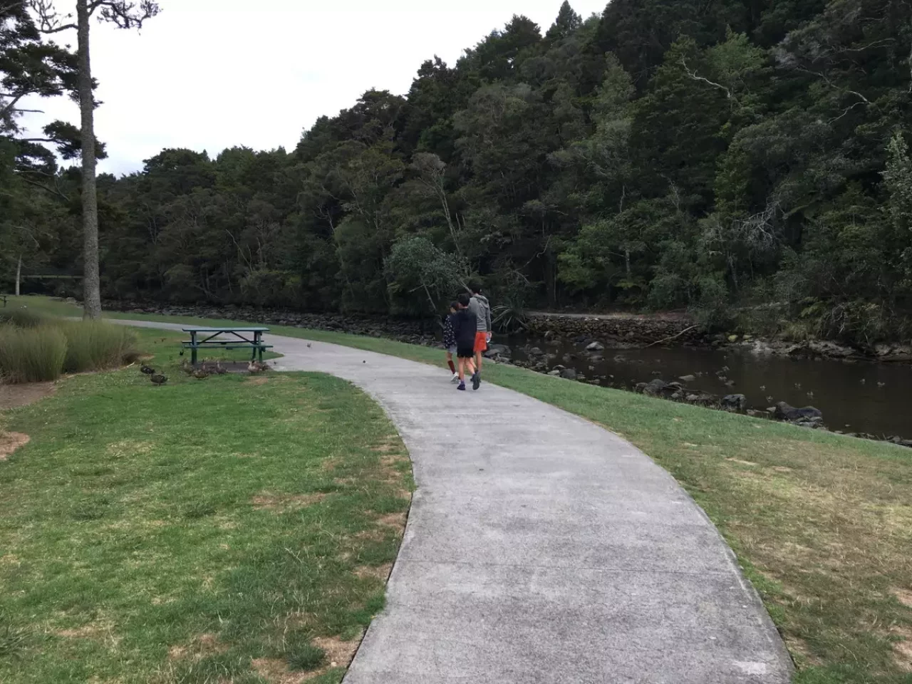 このモーテルの目の前にメア・パークという公園がある。この公園からハテア川に下っていくとパリハカの丘の頂上へ向かうトレイルがある。