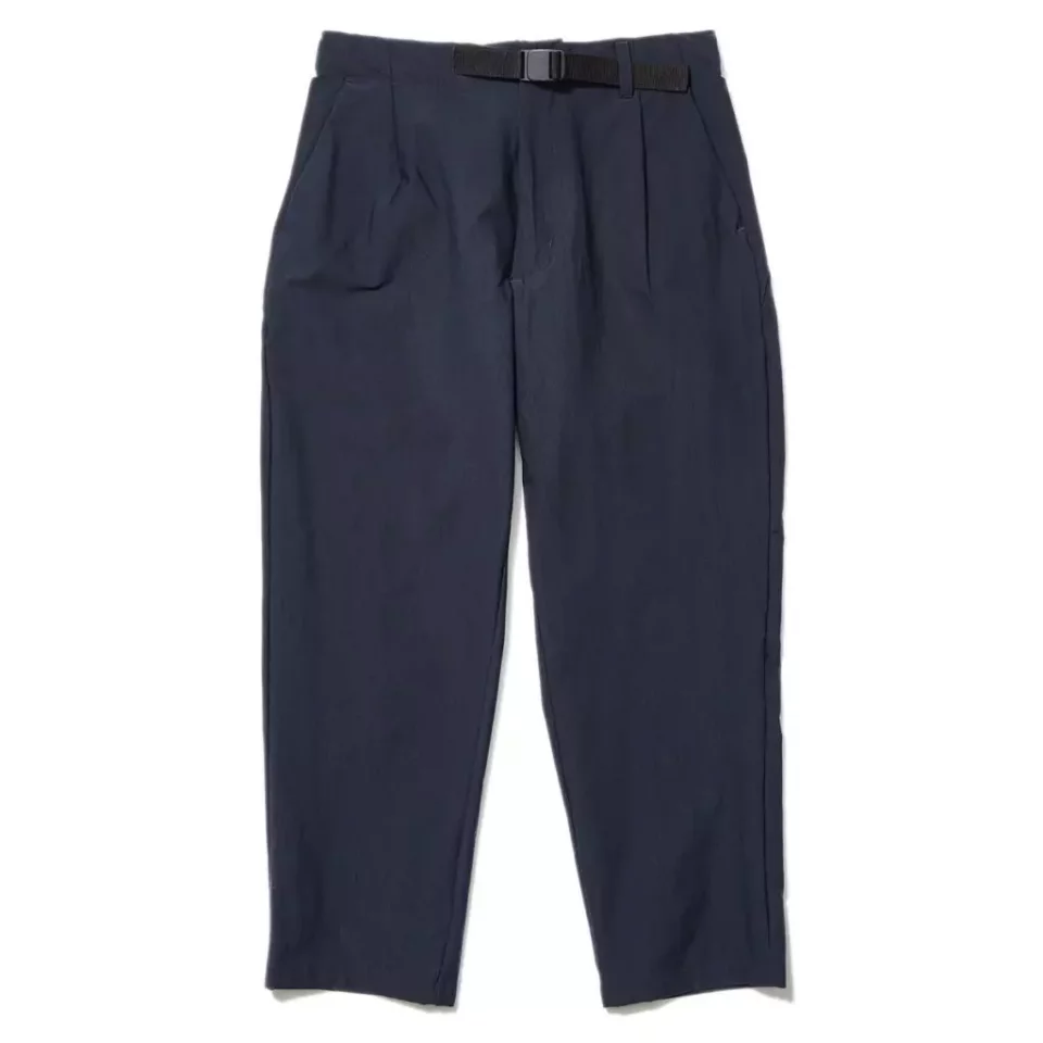 ナチュラルな風合いで、ストレッチ機能を備えたツイル生地を使用したパンツ。ヴィンテージライクな質感も魅力です。ワンタックを入れてややワイドに仕上げ、裾にかけてはテーパードシルエットに。ウエストは、バックルのカジュアルな仕様です。素材はドライタッチで、快適な穿き心地です。左の腰ポケット内側にはファスナー付きセキュリティポケットがあり、鍵や小銭などの収納に重宝。バックポケットは、ヒップラインに沿うようカーブさせた切り替えラインを生かして配置。収納力があり、デザインアクセントにもなっています。