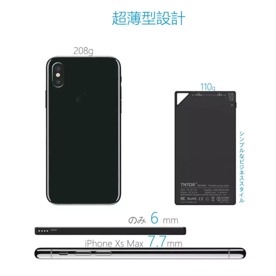 厚さわずか6mm。 高品質のスチール製。 滑らかな触感。財布、ポケットに入れることができ、多くのスペースを取りません。バッテリー容量は3.7V/5000mAh/18.5Wh。充電回数はiPhone 11 Pro 1.2回,iPhone X 1.3回,iPhone8 2回。1~2泊程度の縦走をカバーしてくれる容量です。重量:約116gです。