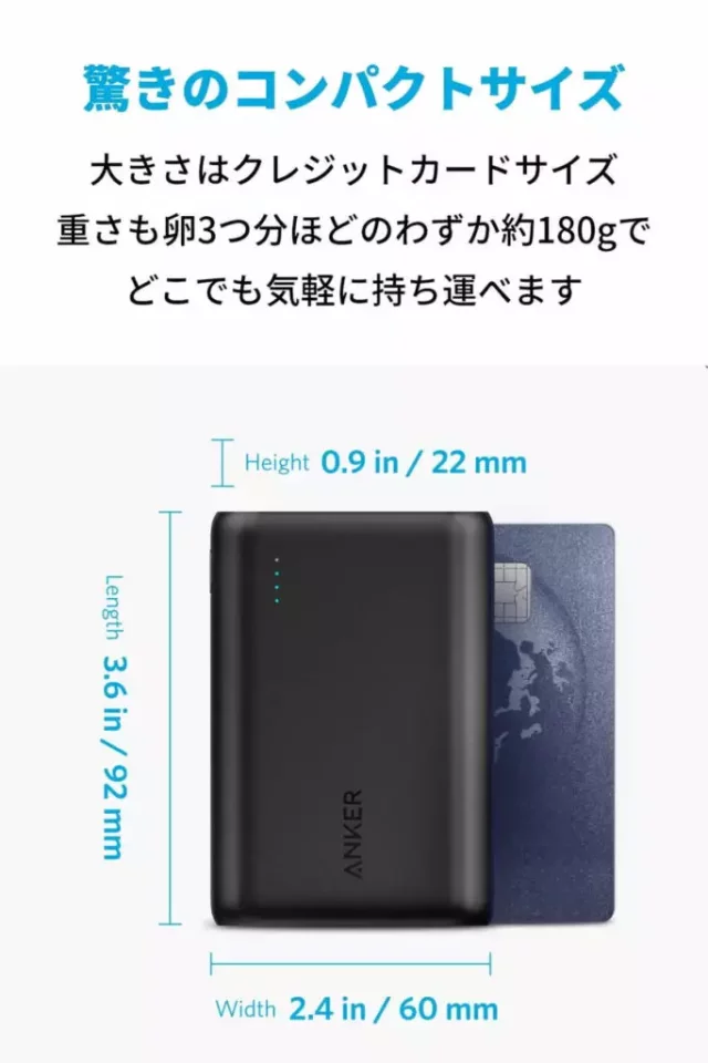 4期連続ベストセラー1位。日本、アメリカ等の世界各国で累計3000万台以上を販売しているロングセラー製品です。日本では、Amazonランキング大賞 2017 (上半期) ~2018(年間)までの4期連続で【バッテリー・充電器】部門のベストセラー1位を受賞。世界最小&最軽量クラス:10000mAh以上のモバイルバッテリーでは、世界最小&最軽量(※2020年1月時点) 。大きさはクレジットカードサイズほどしかなく、重さも卵3つ分ほどのわずか約180g。いつでもどこでも気軽に持ち運べます。iPhone XS / Xに約3回、iPhone 8 / 7に約4回、Galaxy S10に2回以上、iPad Pro (2018, 11インチ)に約1回、その他ほとんどのスマートフォンに複数回の充電が可能です。