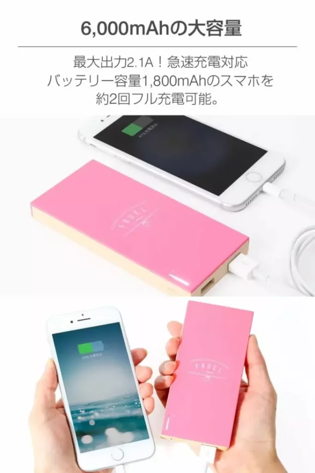 キュートなモバイルバッテリー「FRUEL」。急速充電対応、約2回スマホをフル充電OK!まるでフルーツみたいにカラフルでオシャレなツートーンカラー。気分まで元気にチャージしてくれそうなモバイルバッテリー「FRUEL(フルーエル)」が、2台同時充電対応になって登場しました!スマホを約2回充電できる6,000mAhの大容量、最大2.1Aで急速充電。USBポート×2つで機器を2台同時充電OKです。対応電流を自動認識してくれる「Smart IC」機能搭載も特徴です。