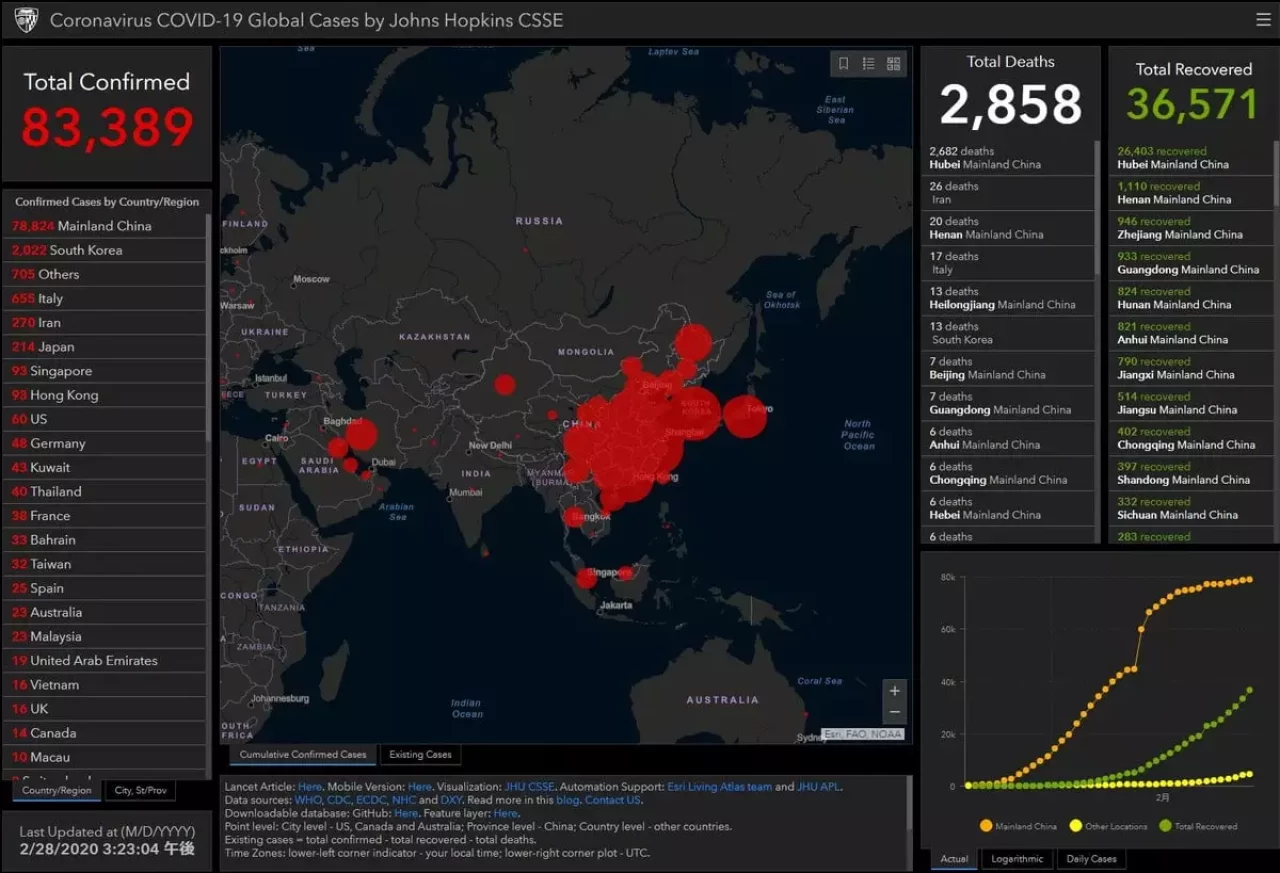 リアルタイムでコロナウイルス感染者を追跡するインタラクティブなツールは「Coronavirus COVID-19 Global Cases by Johns Hopkins CSSE」です。