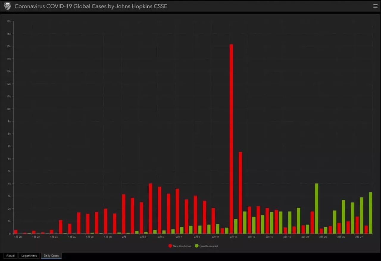 左下になるメニュータブでDaily Casesというタブをみると、日毎での感染者数が確認できます。上の画像で言うと赤のグラフです。2/13には大きく数値が上がっていますが、とあるYoutuberさんに言わせると、何かしら数字の取得ロジックが変わったのかもしれない、このように跳ね上がるような事件性は見受けられない、と言っていました。
