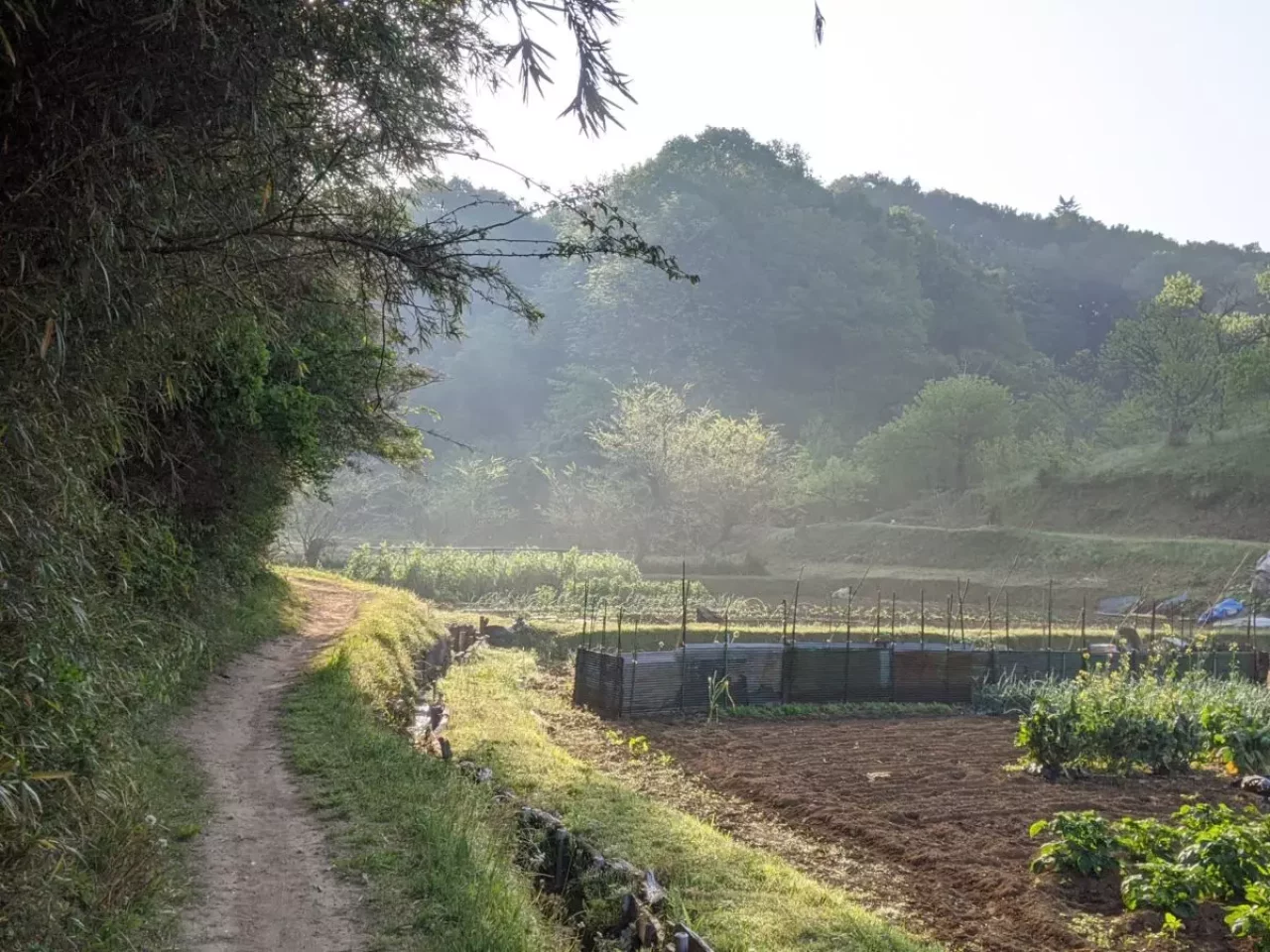 朝靄のかかる谷戸の畑の風景もまたスンとして気持ちがいい。