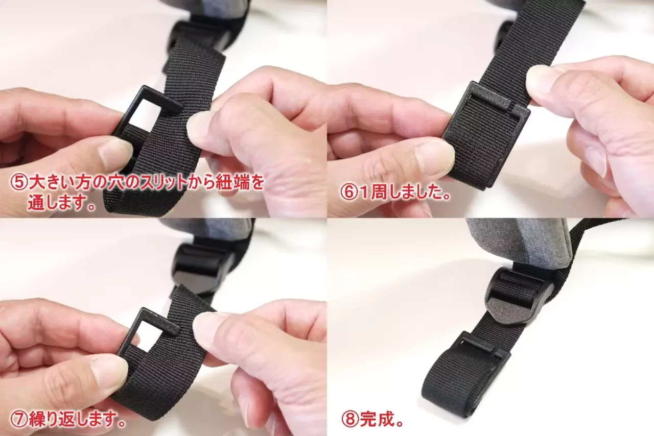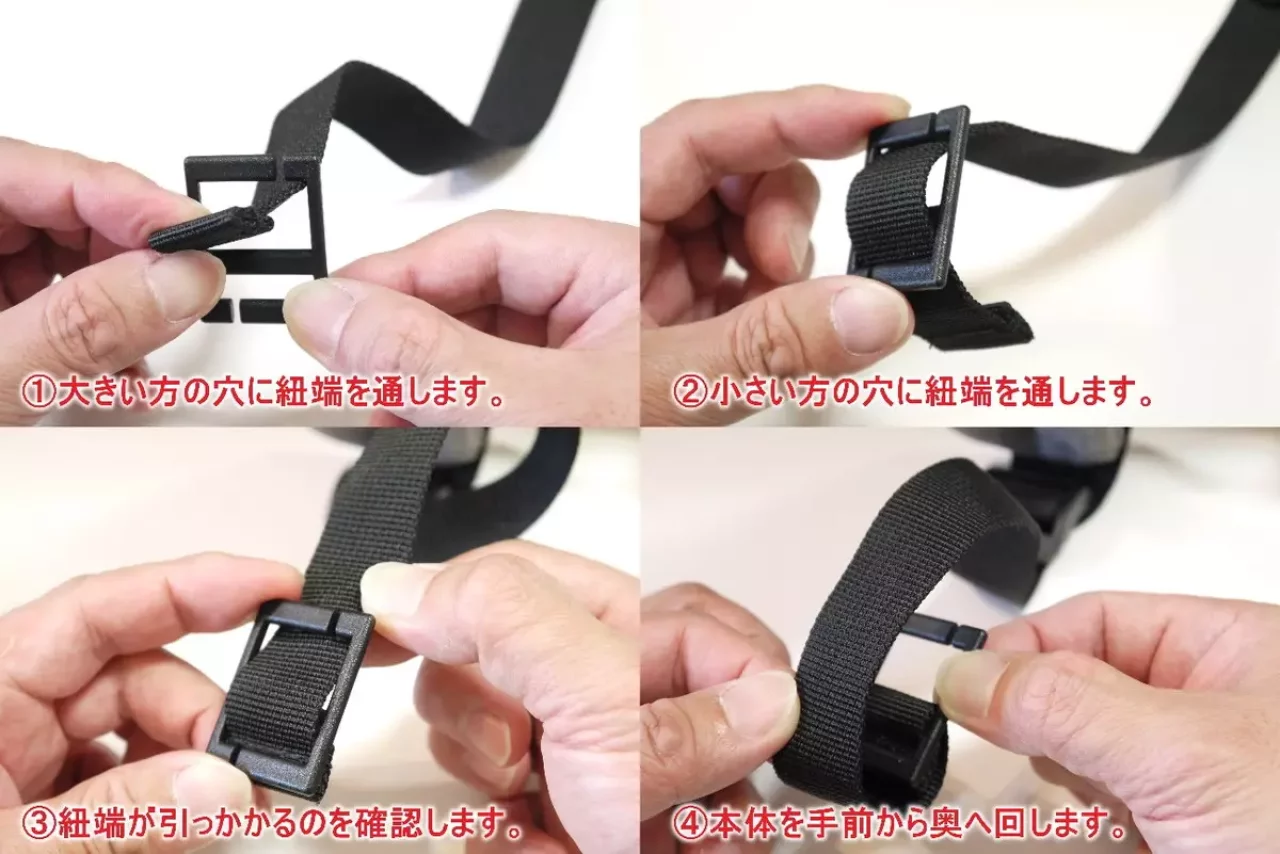 注意点3:紐幅25mmまでの紐端を通すことが出来ますが、23~25mm幅用として設計されています。違ったサイズの紐端で使用すると綺麗に巻き留めておくことが出来ません。