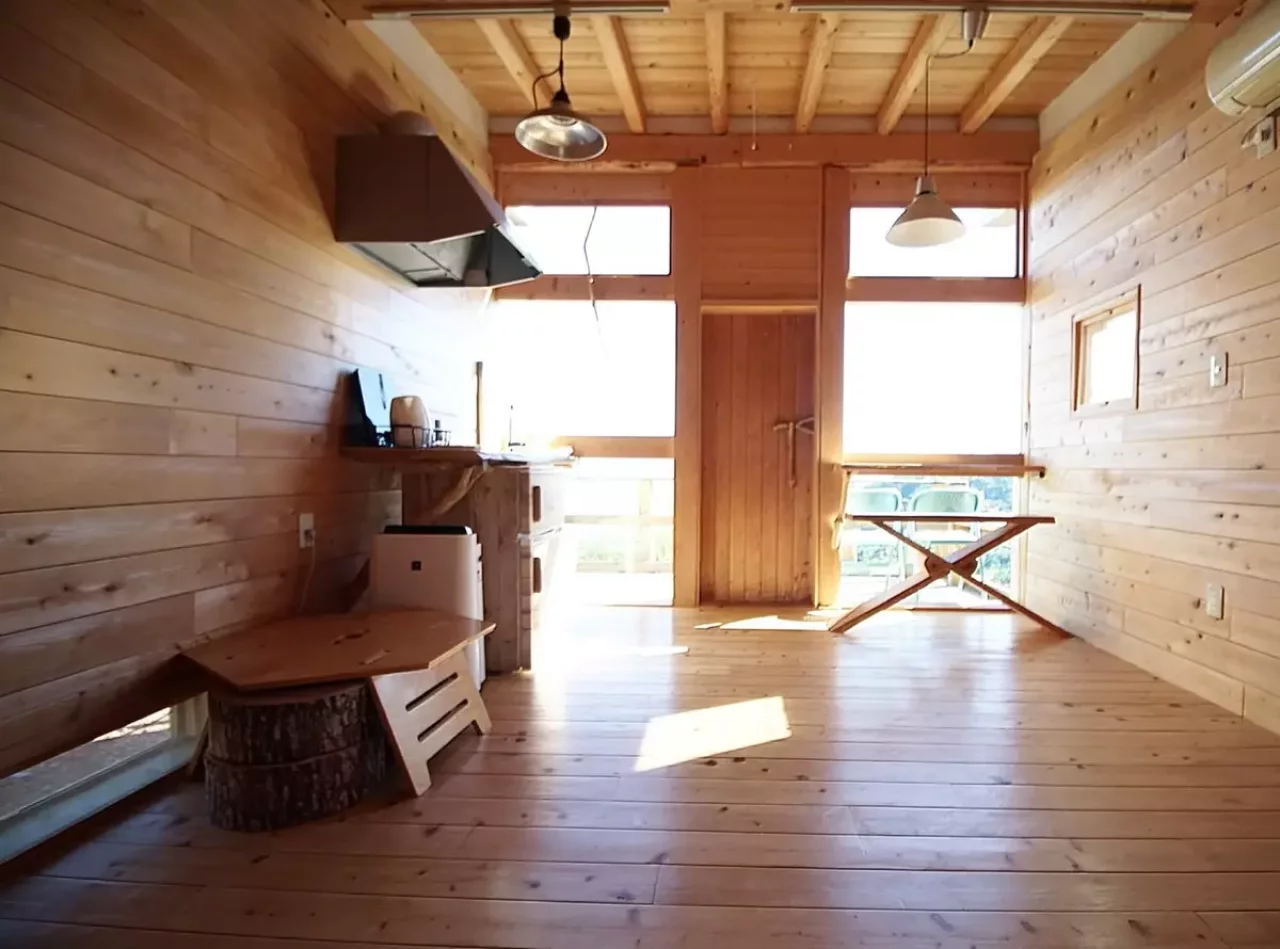 小屋は3種類あり、こちらも名前がユニークだ。建物横には充分な広さのフリースペースがあり、室内からの眺めも魅力的な小屋付きサイト【兄】。