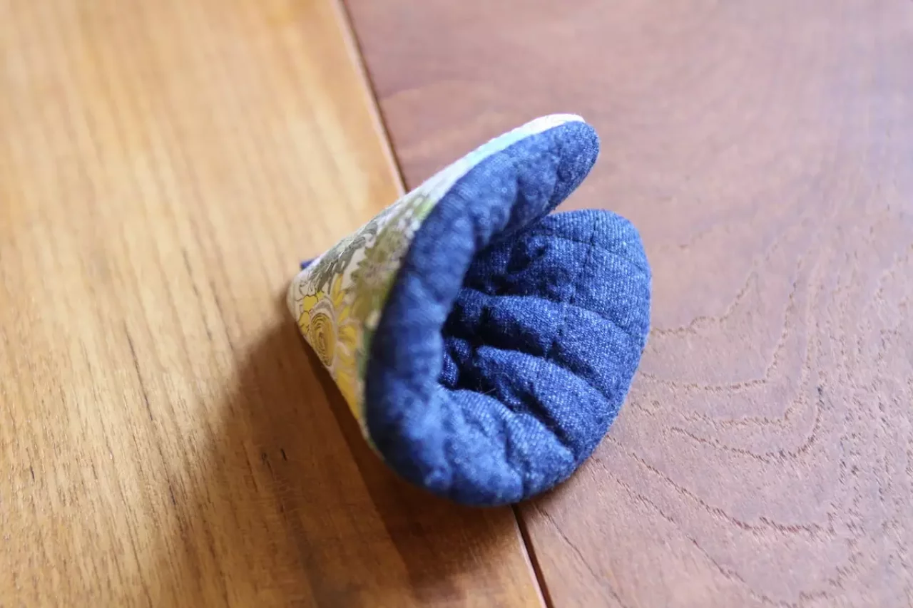 リバティー&デニムの作りですが、リバティーはイギリスロンドン発の高級ファブリックとして知られていて、山型鍋掴みではひまわりなどの花が描かれた生地で作られています。キルト芯は2枚ですが、熱いものを持っても全く問題のない作りです。
