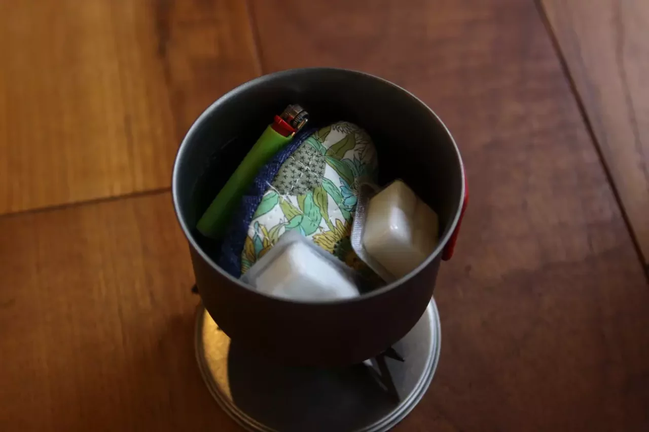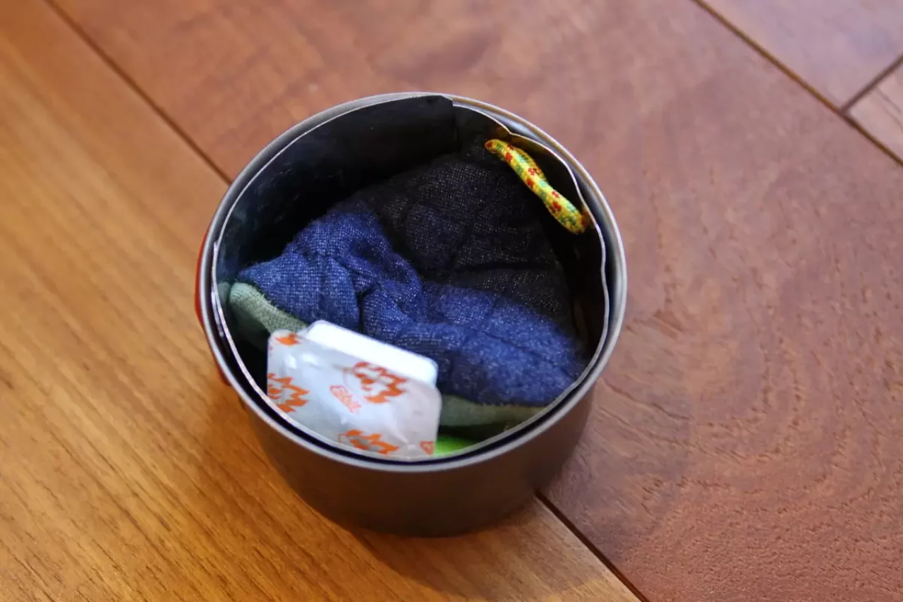 という1つ1つが非常軽くコンパクトな道具を使っています。全ての道具をエバニュー チタンカップ400の中に収めて持ち歩くのですが、この中に山型鍋掴みも入ってしまいます。
