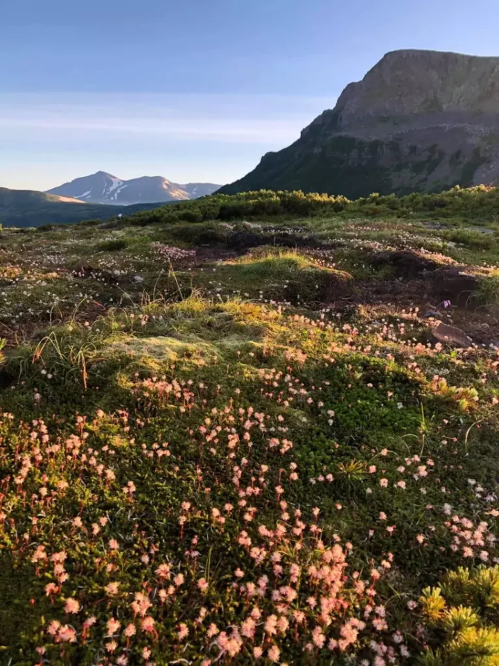 山密なチシマツガザクラたちと朝陽に照らされる旭岳![]()