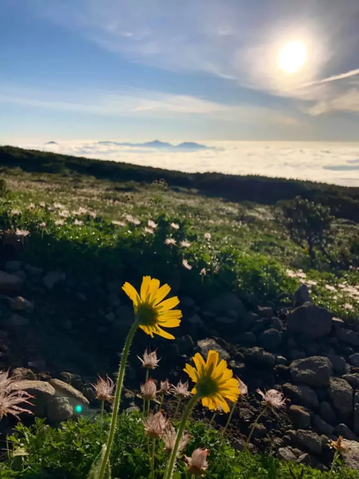 朝陽に向くエゾウサギギクと雲海に浮かぶ武利無加山