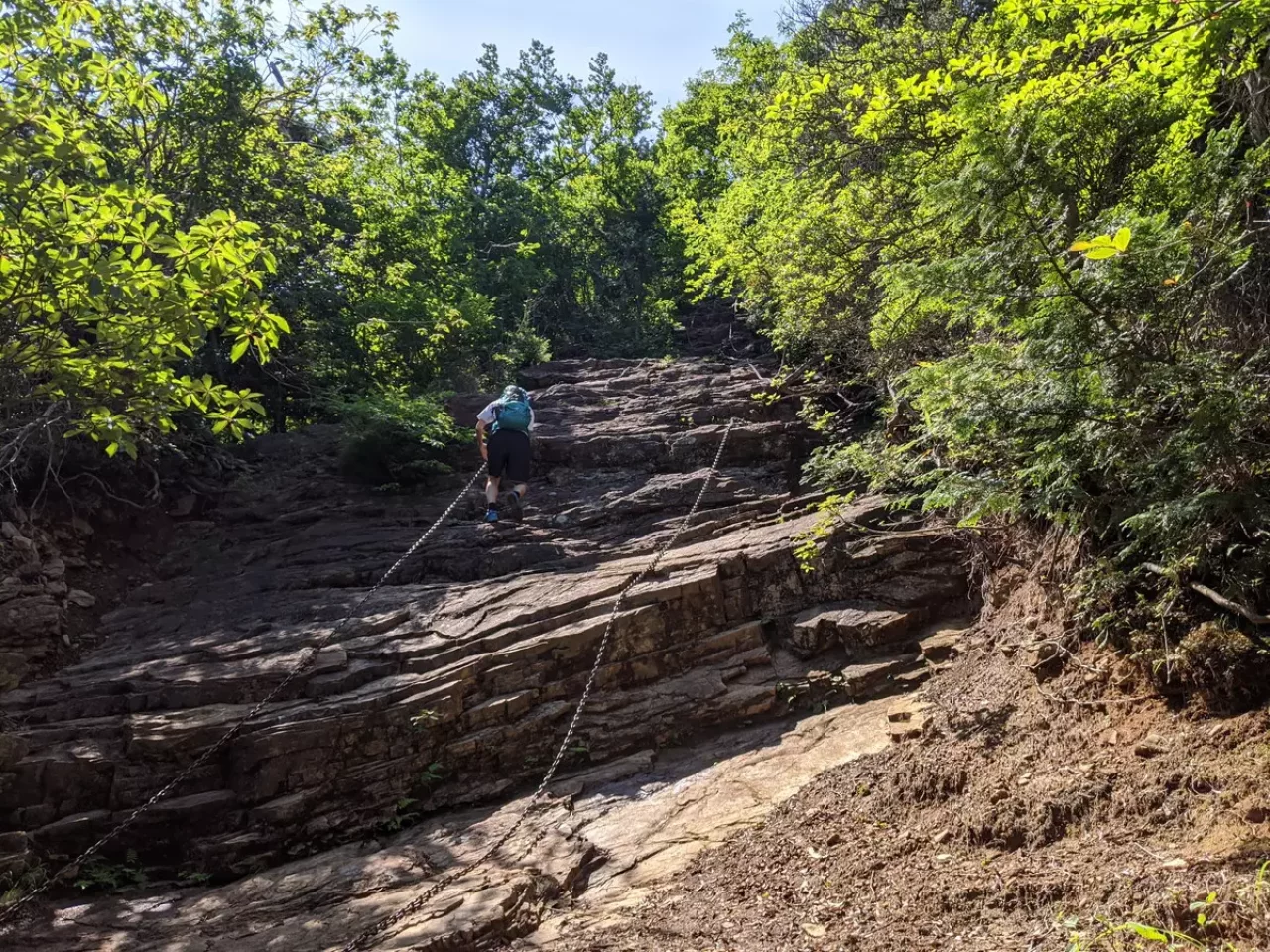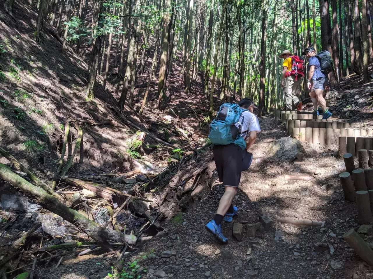 これを見た4人は気が怯むも、YとKは男坂を、DとTは女坂を行く。岩場はなかなかの急登で登り応えがある。YとKは「おお!カッコいいぞ」なんて励まし合いながら岩場を登っていく。中年なんだけど中身は少年のようだ。因みに登りはいいが、下りは危ない。挑戦する際は気をつける必要がありそうだ。