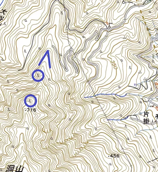 ルートファインディングの基本は尾根歩きです。図中、東の尾根沿いも行けそうです。東北東にも尾根がありますが等高線の間隔が狭いです。近くに露岩帯もあって危険そうです。北北東の尾根筋は等高線の間隔も広く緩やかそうです。