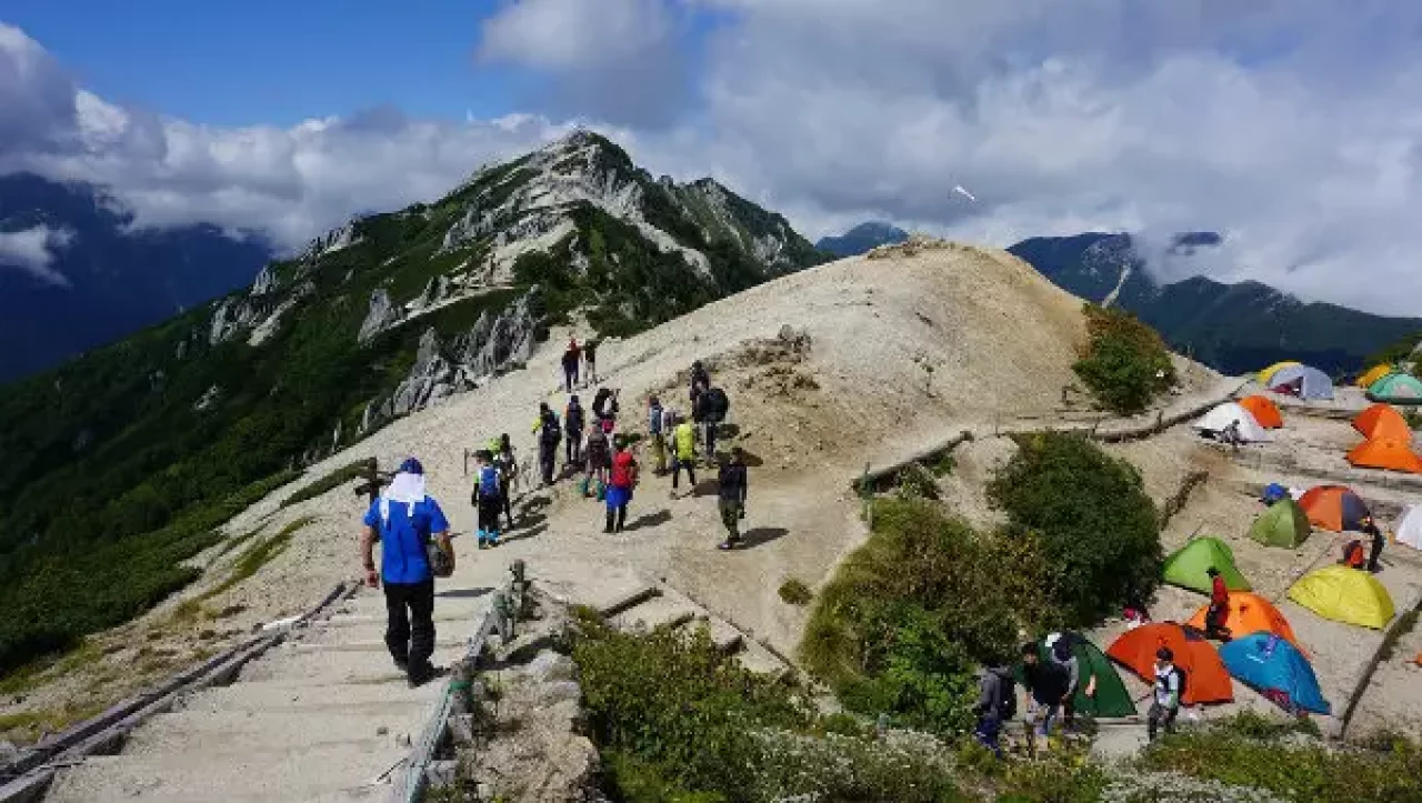 合戦小屋では宿泊はできないが、売店があり休憩するにはよい。小屋から最後の急坂を登って合戦沢ノ頭に出る。ここからは右手に燕岳、左手に大天井岳が見え、槍の穂先も稜線の上に頭を出している。