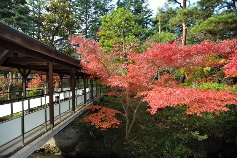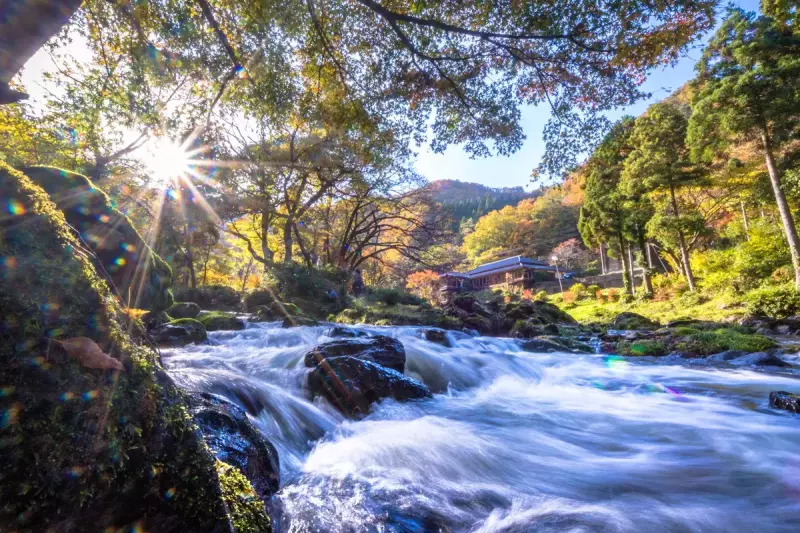 山中の温泉街に沿って流れる大聖寺川の渓谷で、その美しさは北陸随一と言われます。約1.3kmの渓谷沿いの区間は遊歩道が整備され、川を眺めながらゆっくり歩くことができます。総ひのき造りの風情あるこおろぎ橋や、S字型の斬新なデザインのあやとりはしなどの人気観光地も、紅葉深まる秋にはより一層美しい姿を楽しめます。