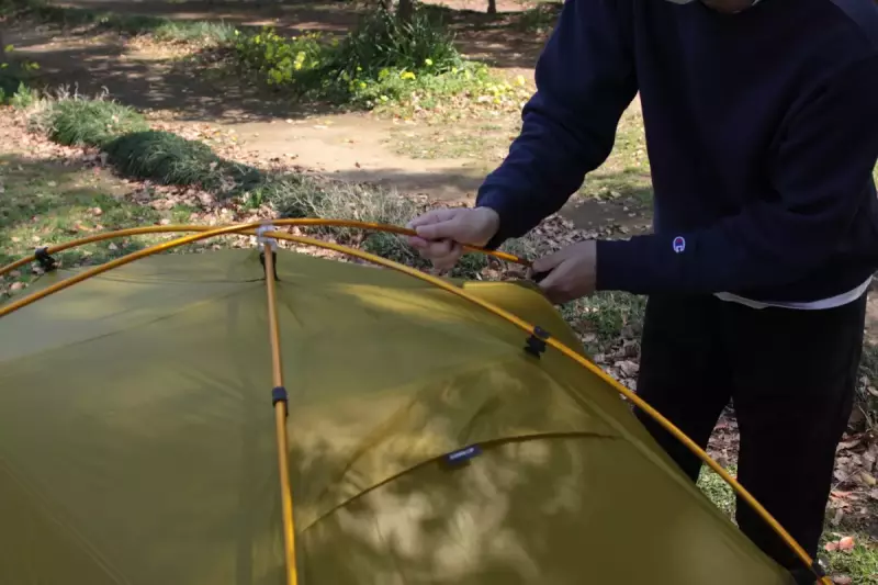 スリーブにボールを通して組み立てるテントですが、ポールは一本で非自立式です。またシングルウォールなのでシンプルな作りで設営撤収が簡潔に行えると言う特徴があります。